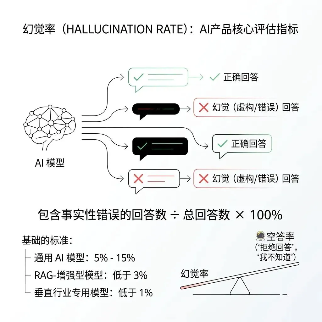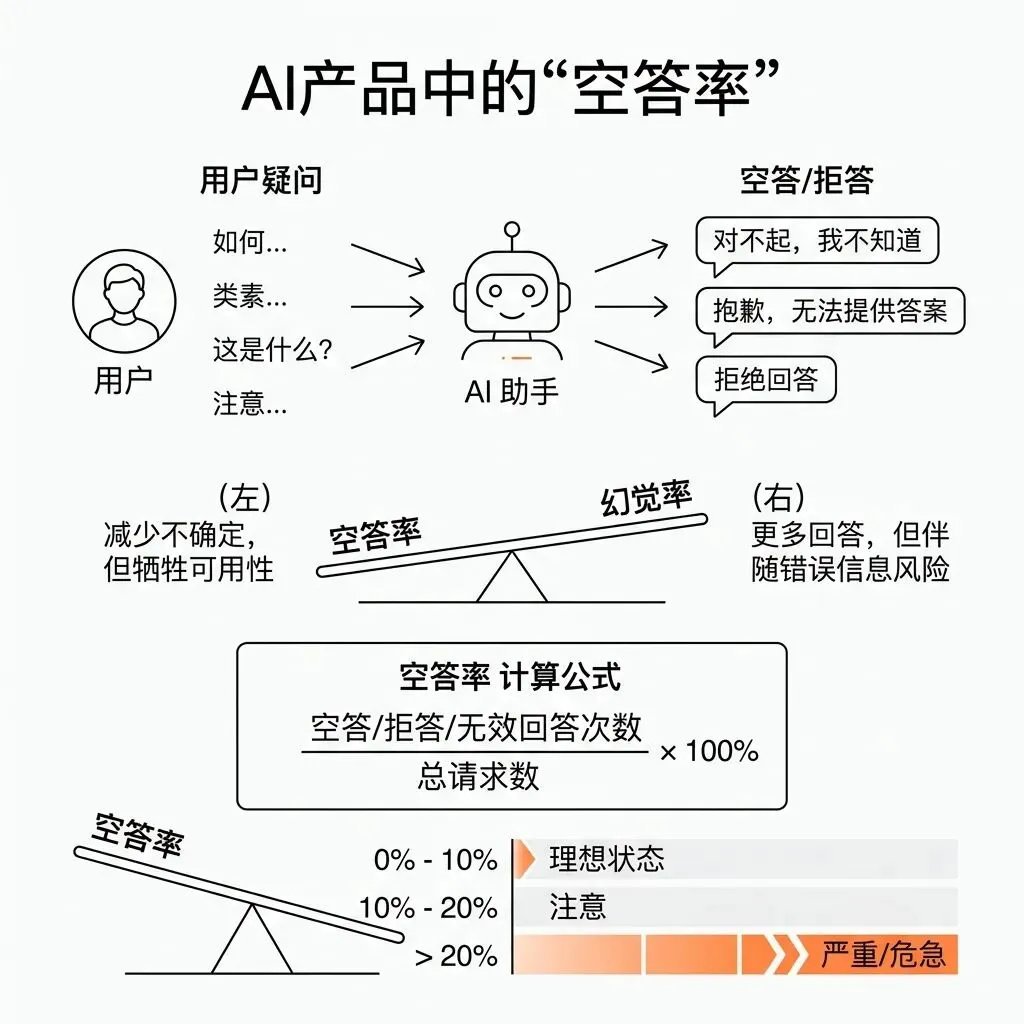 空答并不是简单的报错或沉默。更隐蔽的形态是模型给了一大段看似正经的文字,但实际上全是模板化的废话,什么有用信息都没提供。比如用户问一个具体的退换货政策细节,AI 回复一串笼统的客服话术但完全不涉及核心条款,这本质上也是空答。空答率和幻觉率是一对天然的跷跷板,压低一个必然推高另一个,产品经理必须找到业务能接受的平衡区间。