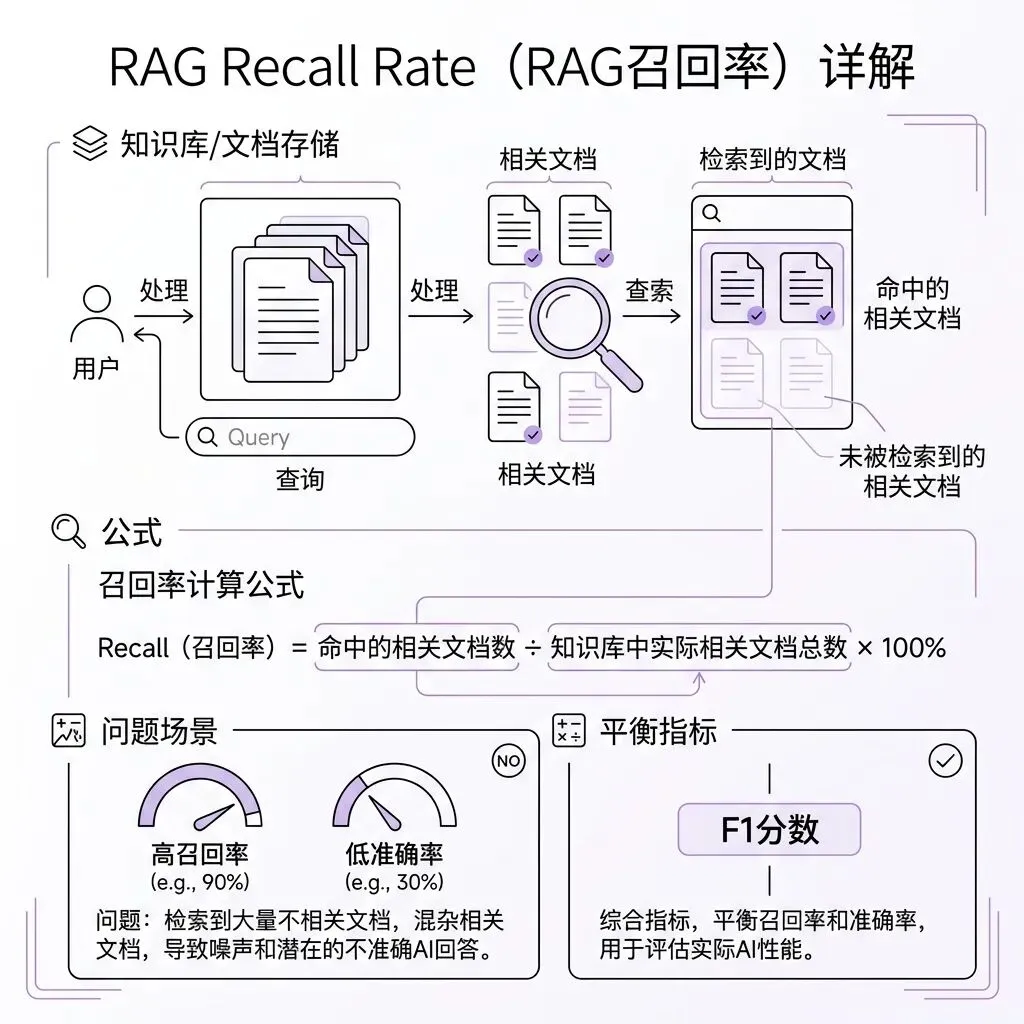 RAG 是目前企业级 AI 产品最主流的知识增强架构。用户问一个问题,系统先去知识库里用向量检索或关键词匹配捞出相关文档,再把这些文档塞给大模型做生成。召回率衡量的是第一步检索的覆盖能力,也就是知识库里确实存在的正确答案,检索引擎到底有没有找到它。如果正确答案压根没被捞出来,后面的大模型再聪明也是巧妇难为无米之炊。