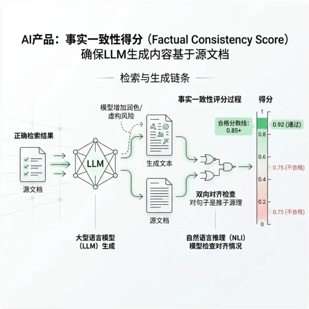大模型在拿到参考文档后进行文本生成时,并不会老老实实地只从文档里摘取信息。它经常会根据自己训练阶段学到的知识做补充甚至篡改,比如把文档里的具体价格改成另一个数字,或者在引用原文时悄悄加上文档里根本没有的限定条件。事实一致性就是衡量模型最终输出和输入参考资料之间的对齐程度。