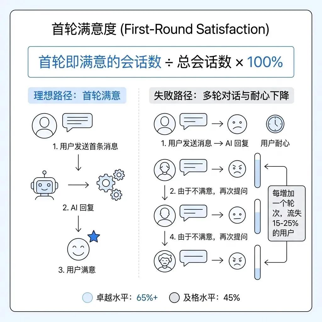 在传统搜索引擎时代,用户已经被训练成了一种习惯:输入关键词、0.3 秒出结果列表、快速扫描找到目标。AI 对话产品天然继承了这种即时期待。用户第一轮提问时的容忍窗口极短,如果 AI 的首轮回答不着边际或者需要追问才能理解用户意图,好感度会断崖式下跌。这个指标直接衡量的就是系统在首次交互中一击命中的能力。
