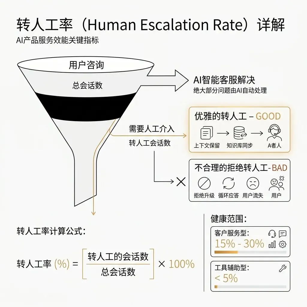 转人工不一定是坏事。在很多复杂场景下,AI 前置收集好用户信息再转交人工处理,整体效率反而更高。真正要警惕的是两种极端:一种是转人工率被当成负面 KPI 狠狠压低,AI 能力见底时还在那死撑装蒜,只会彻底激怒用户;另一种是转人工通道藏得太深或者体验太差,用户想找人工都找不着,被迫在一个解决不了问题的 AI 面前反复碰壁。