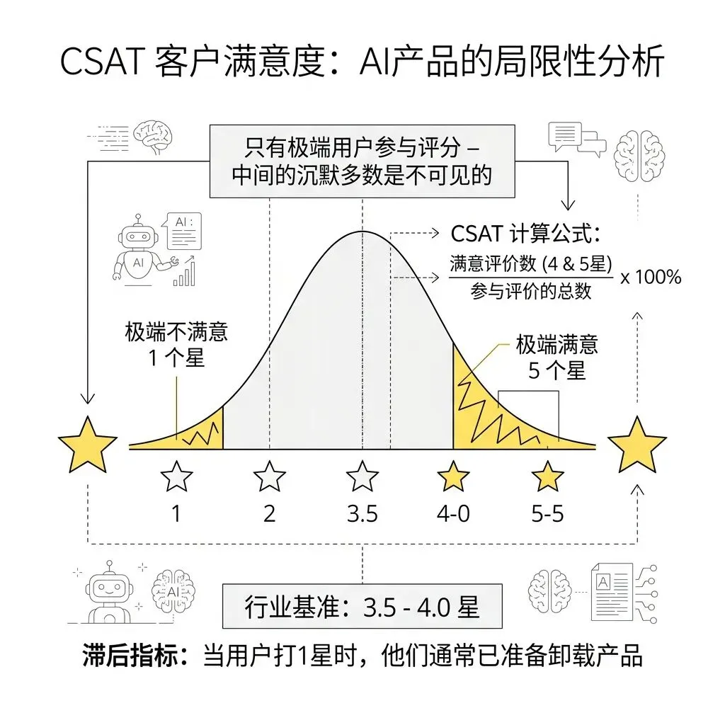 CSAT 其实是一个极毒的滞后指标。沉默的大多数都在用脚投票,只能拿它看宽泛的防守趋势,绝不能拿来做进取决策。