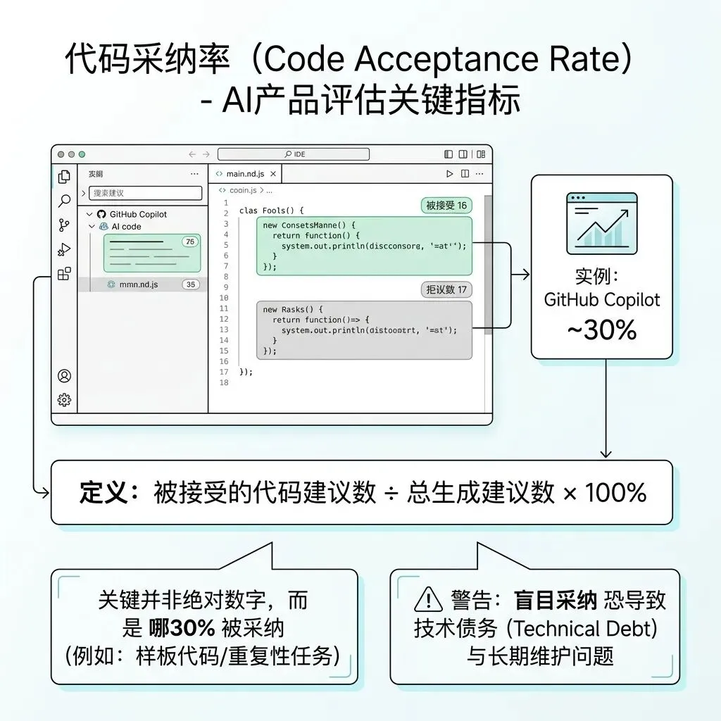 在 GitHub Copilot、Cursor 等 AI 编程助手中,这个指标直接决定产品的商业价值。AI 生成的代码建议弹出来之后,开发者到底有多大比例会按 Tab 接受?这背后衡量的是生成质量、上下文理解能力、代码风格适配度等综合能力。采纳率太低说明生成质量差、干扰开发节奏;但也不是越高越好,盲目接受低质量代码会埋下技术债。