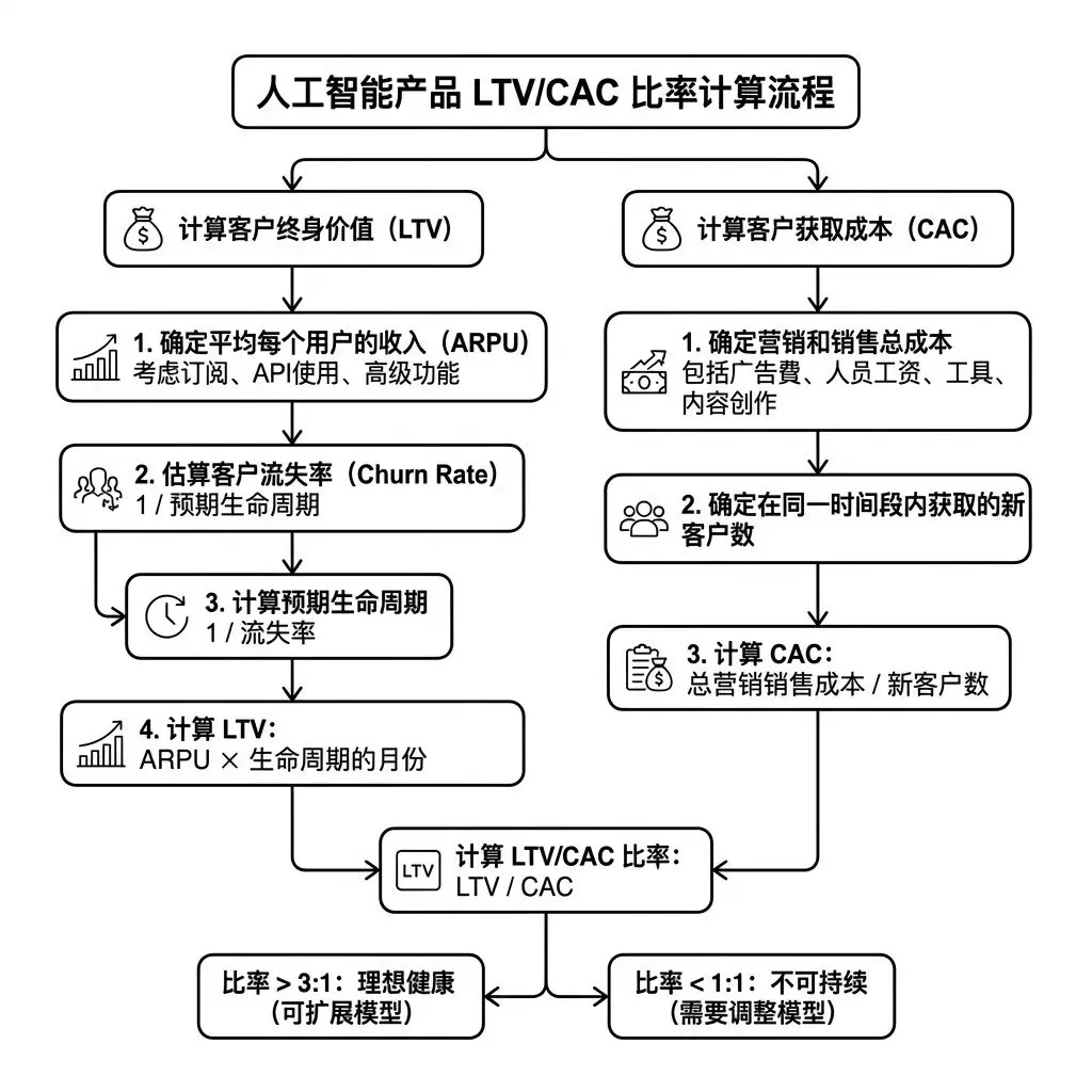 LTV 是用户生命周期价值,CAC 是获客成本。传统 SaaS 产品的边际成本几乎为零,用户越多、使用越频繁,摊薄后的单位成本越低。但 AI 产品完全相反,每个用户的每次交互都会产生实实在在的算力消耗。用户越活跃,你烧的钱越多。这意味着在计算 LTV 时必须把持续的算力成本扣除掉,算出的是净 LTV 而不是毛 LTV。