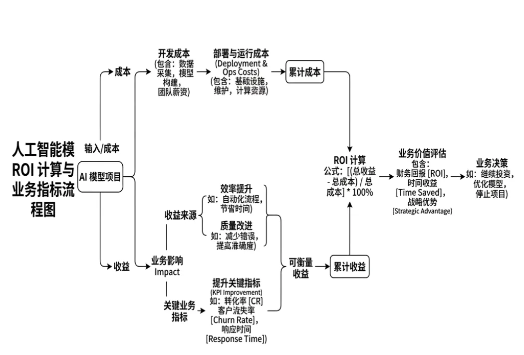 模型 ROI 是最终的商业审判指标。分子是 AI 系统带来的所有可量化收益,包括直接的收入增长、人力成本节省、运营效率提升的折算价值等;分母是 AI 系统的全口径投入,包括模型训练/微调成本、API 调用费、基础设施费用、数据标注费用、工程人力等。ROI 低于 100% 就意味着投入大于产出,业务在亏钱。