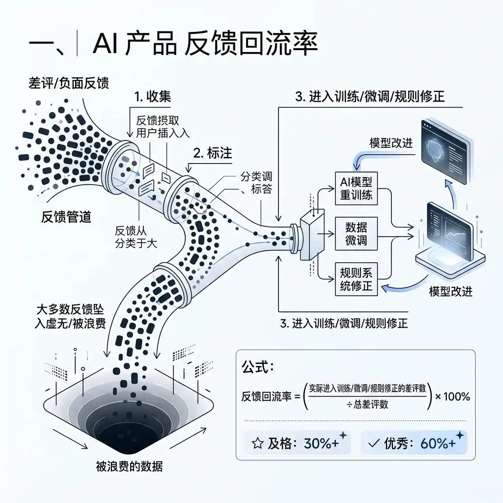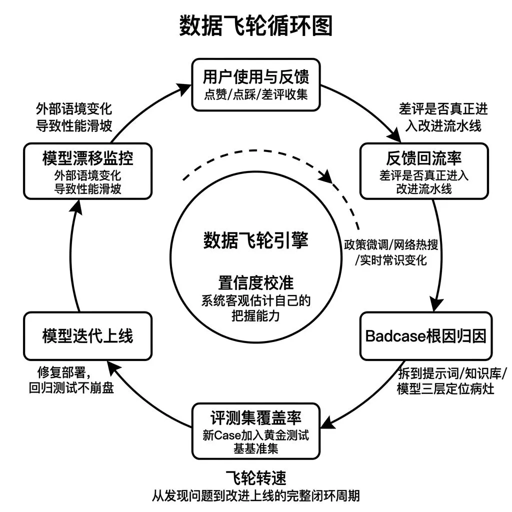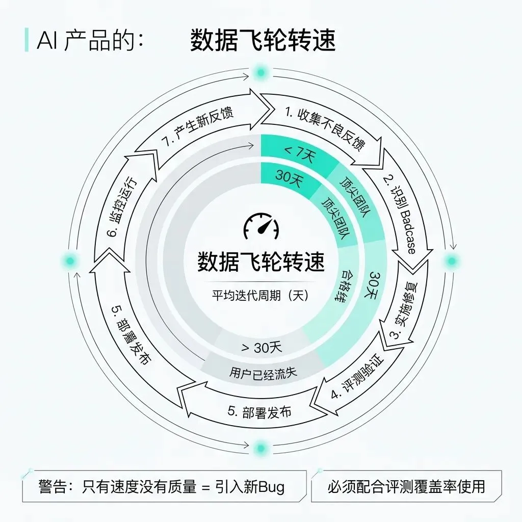 数据飞轮是 AI 产品最核心的竞争壁垒。完整的一圈包括:用户使用产生反馈 → 反馈被收集和清洗 → 问题被归因定位 → 修复方案被开发 → 新版本上线验证 → 用户体验改善产生更多正向反馈。这个闭环转得越快,产品迭代越快,竞争对手越难追赶。顶级团队能做到 7 天一个完整轮次,一般团队可能需要一两个月。