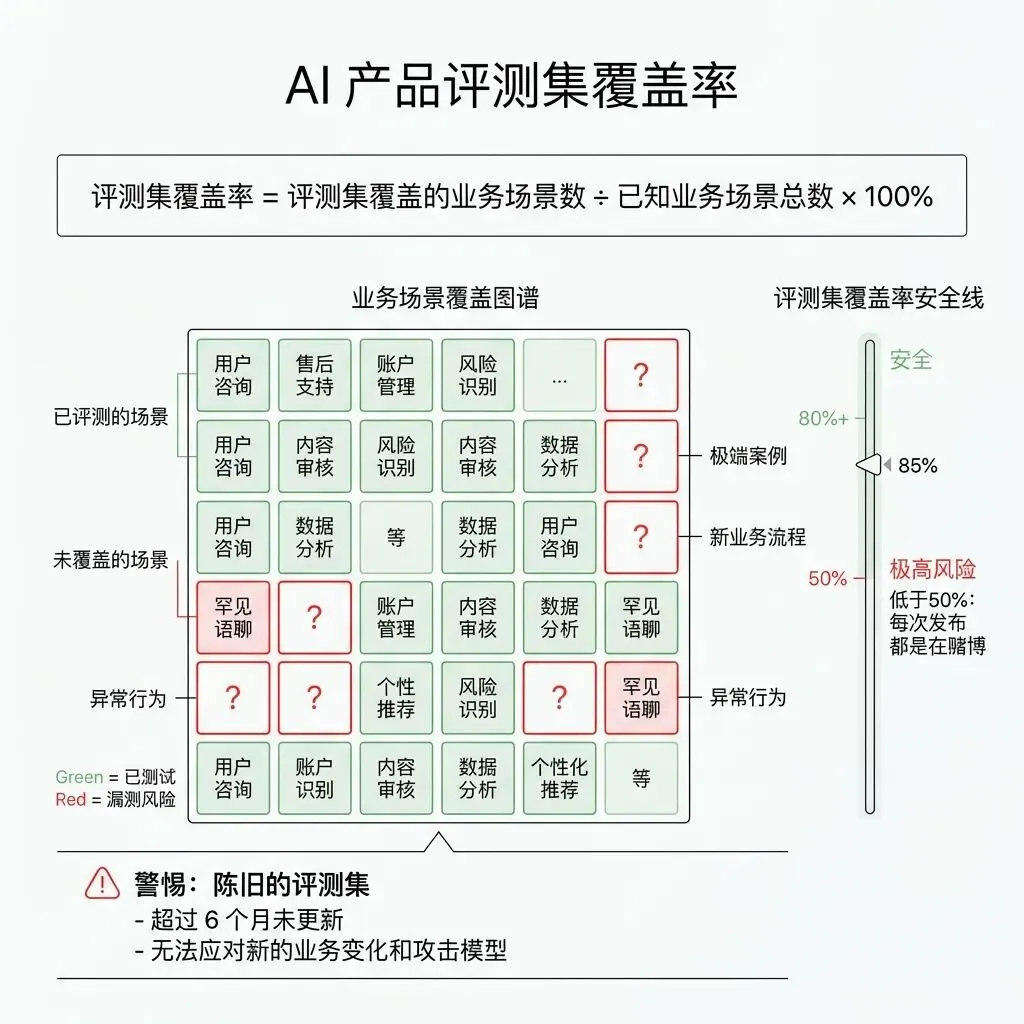 评测集是 AI 产品的质量防线。每次发版之前用一组标准化的测试用例跑一遍回归测试,确保新改动没有破坏已有功能。但业务在变化、用户在进化、新场景在不断冒出来,如果评测集半年不更新,它能覆盖的场景范围就在持续萎缩。