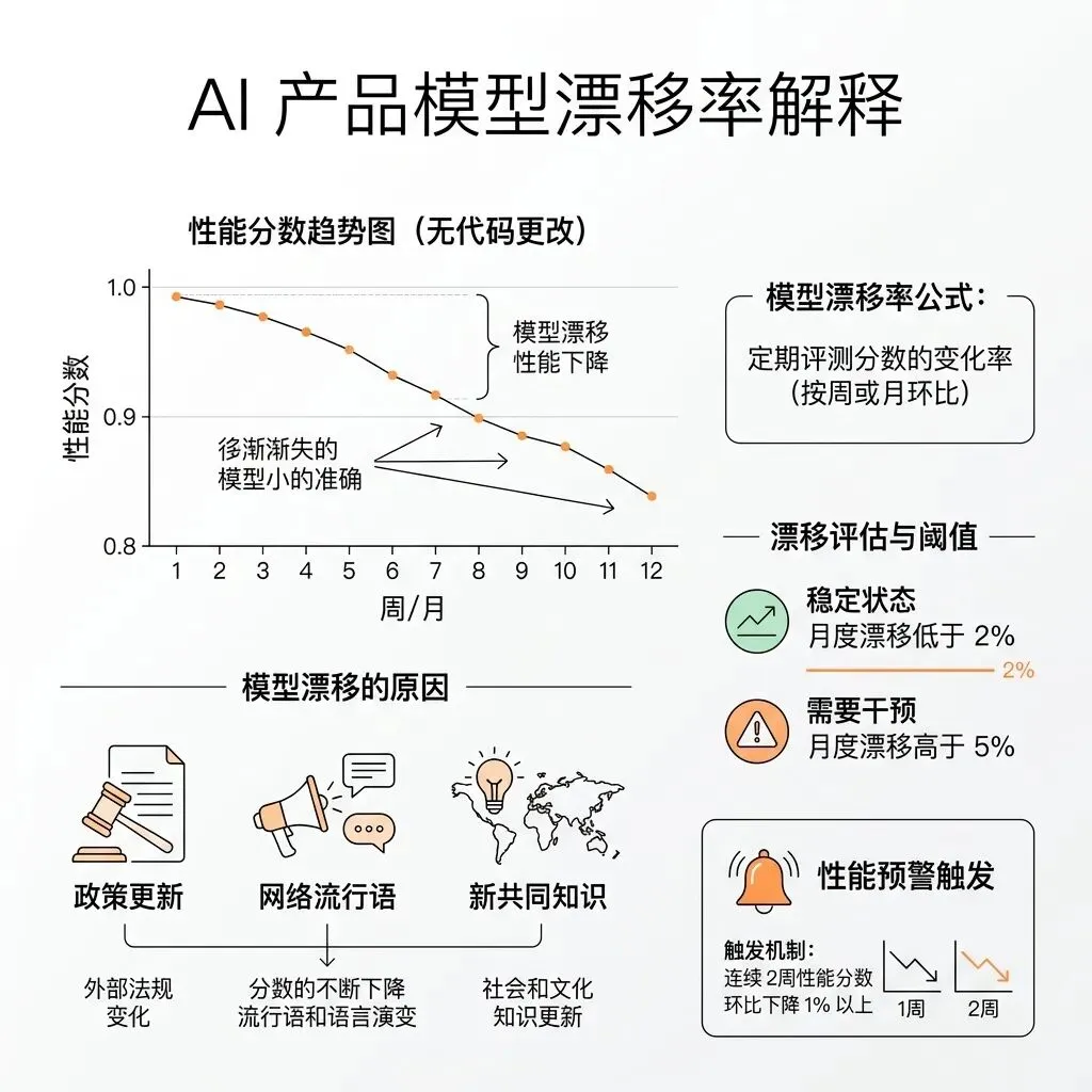 模型漂移是 AI 产品特有的隐形杀手。即使你一行代码都没改、一条知识都没动,模型的表现也可能随时间悄悄变差。如果你调用的是云端 API,供应商会在后台静默更新模型版本;