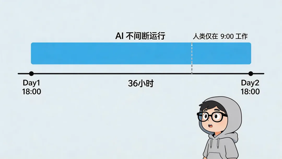 36小时连续运行意味着:以前需要你分步骤监控一整天的工作,现在可以交给AI跑一夜,第二天早上你只检查结果。这不是"AI更强了",这是"以前必须由人盯着的工作,现在可以脱手了"。