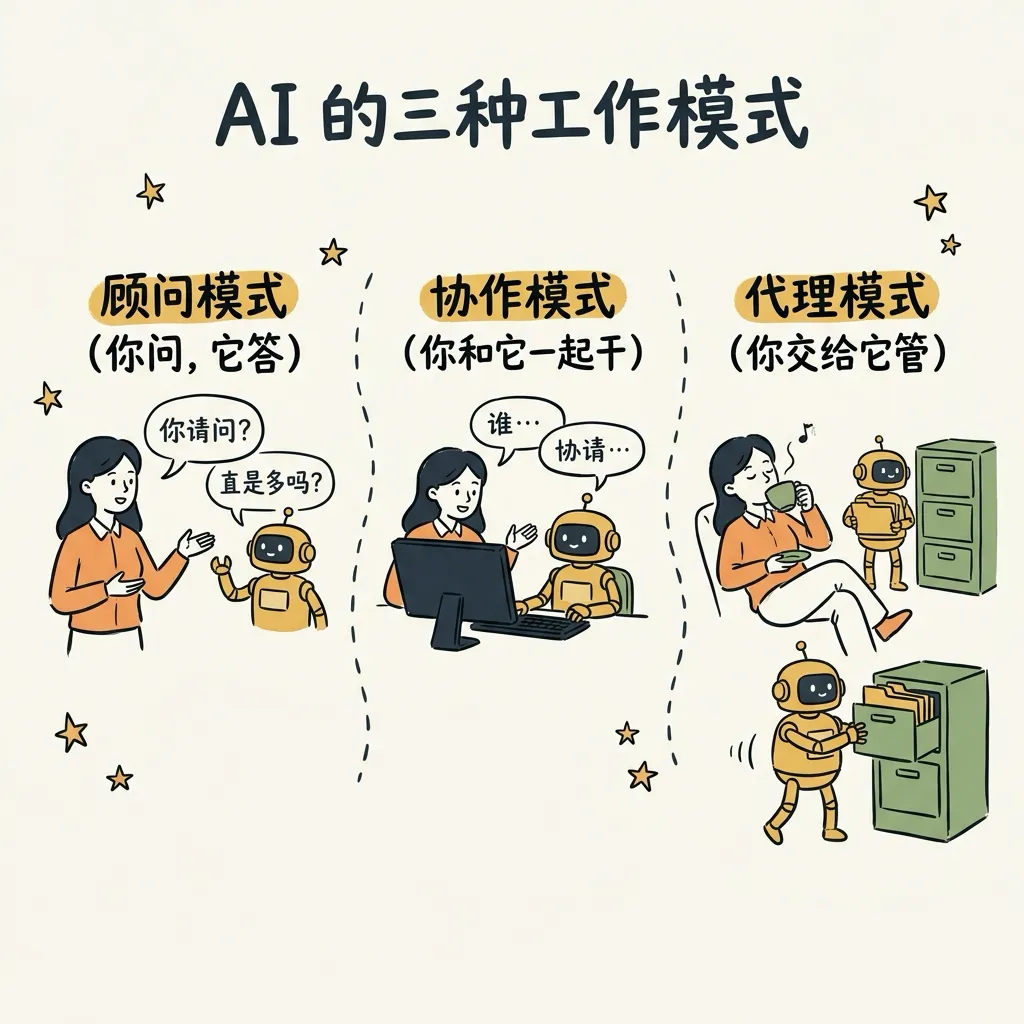 过去我们用 AI,主要是把它当作一个问答器、检索器、润色器。现在开始出现的,是两种更深的协作关系: