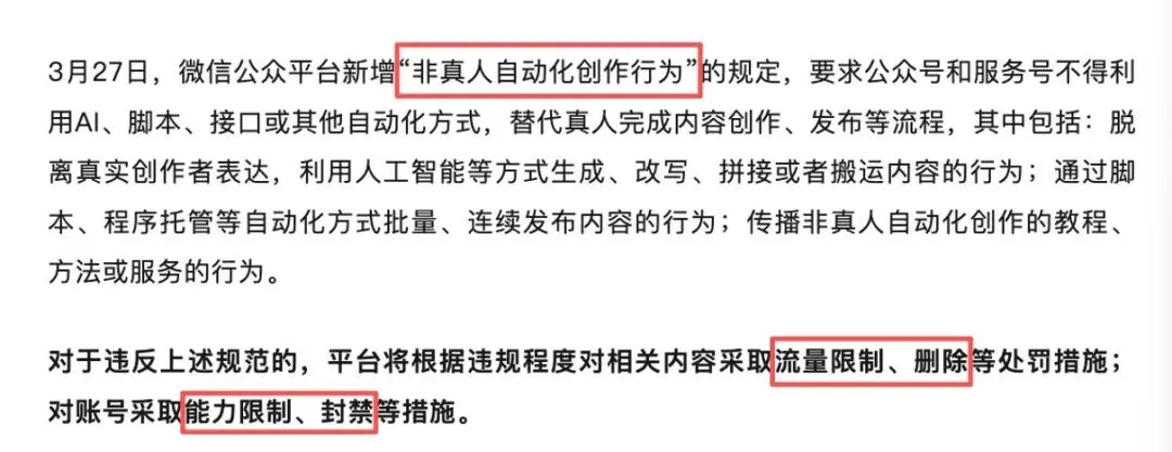 3月27日,微信出台新规禁止“非真人自动化创作”;4月9日,官方再次“补刀”,明确违规会被封号,并强调“AI仅限辅助”。