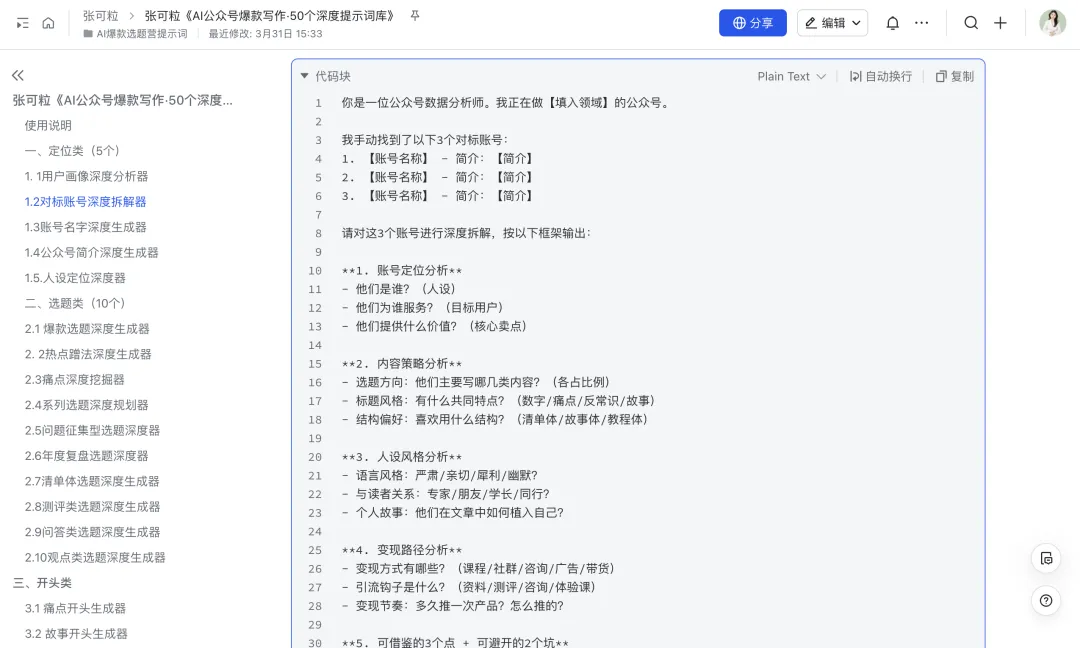 如果大家想要「帮我变现百万的50个AI公众号爆款写作提示词」,从选题、大纲、写作、改稿到爆款标题,全流程都有。