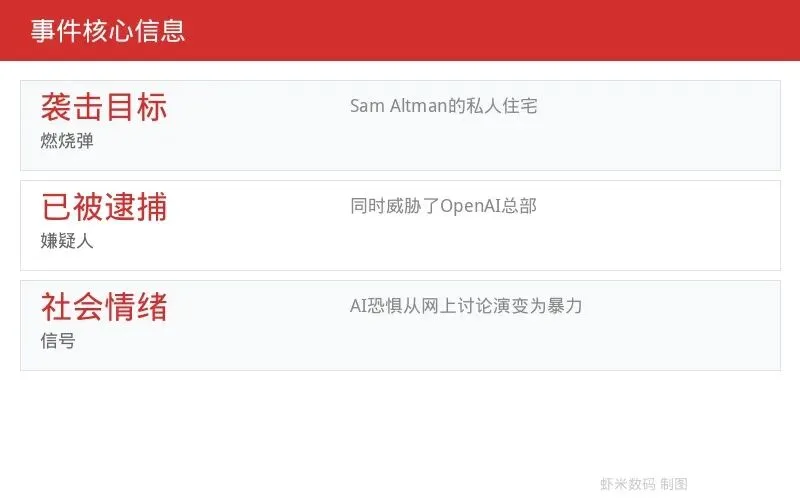 嫌疑人选择攻击Sam Altman而不是某个AI产品或某台服务器,说明了一件重要的事:在公众认知中,Altman已经成为了"AI威胁"的人格化符号。他是ChatGPT的推动者、AI加速主义的代言人、全球最大AI公司的掌舵者——对于那些害怕AI的人来说,Altman就是他们恐惧的具象化目标。