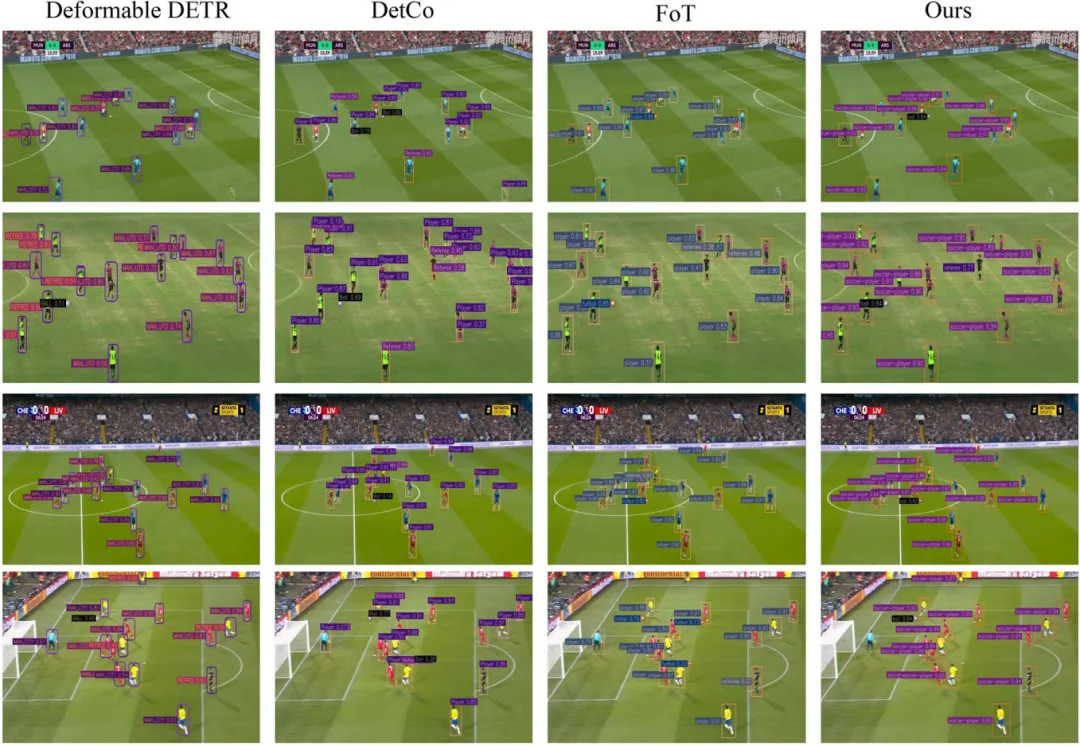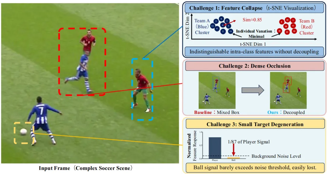 传统检测模型(Faster R‑CNN、YOLO、DETR 等)在足球场景会出现严重失效,研究团队把问题总结为三点:
