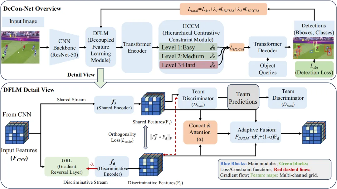 DeCon‑Net 基于 DETR 架构,新增两个关键模块,实现 “分得清、找得准、不丢球”。