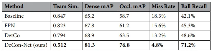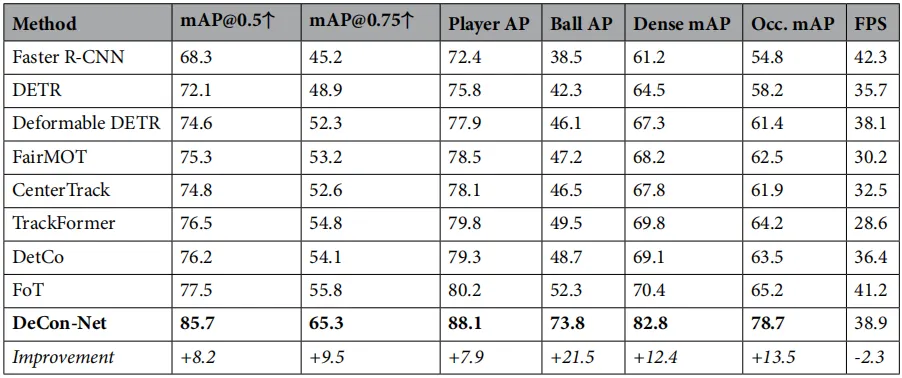 在 SportsMOT 和 SoccerNet‑Tracking 两大权威数据集上,DeCon‑Net 全面超越 SOTA 模型。