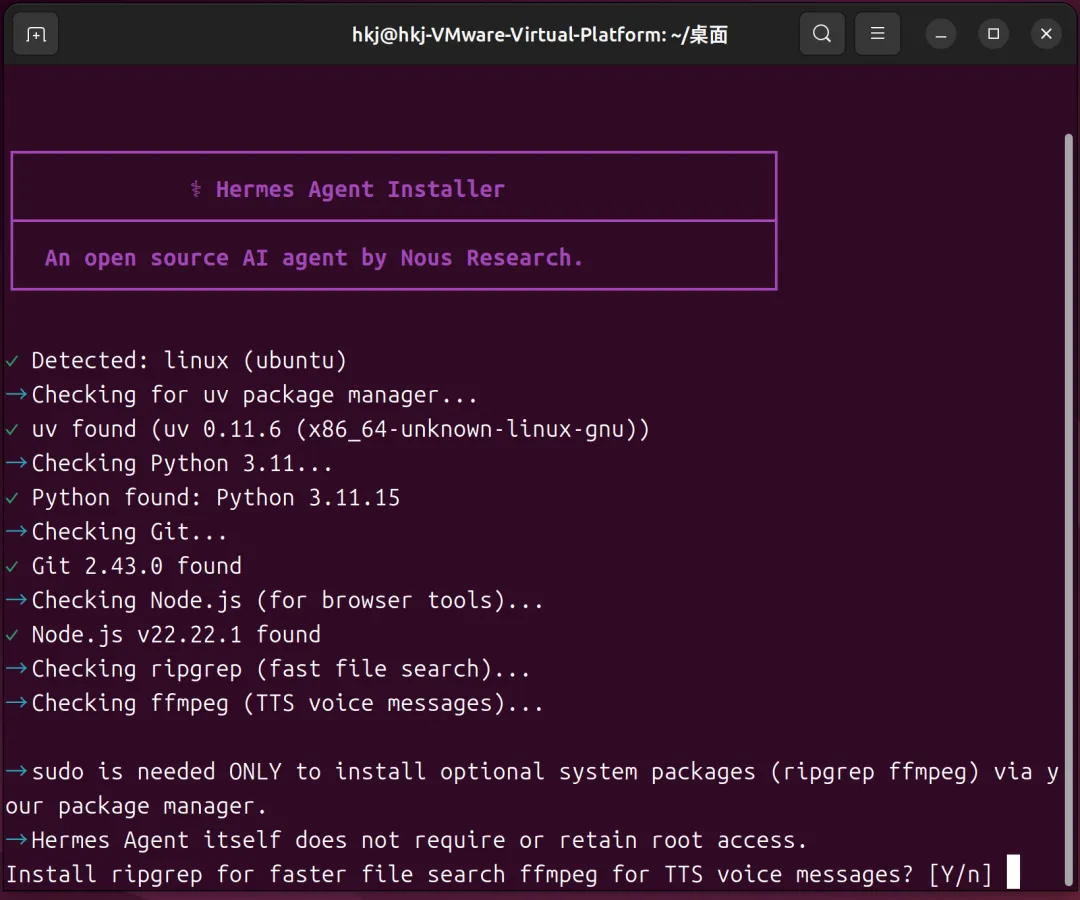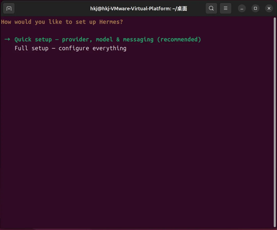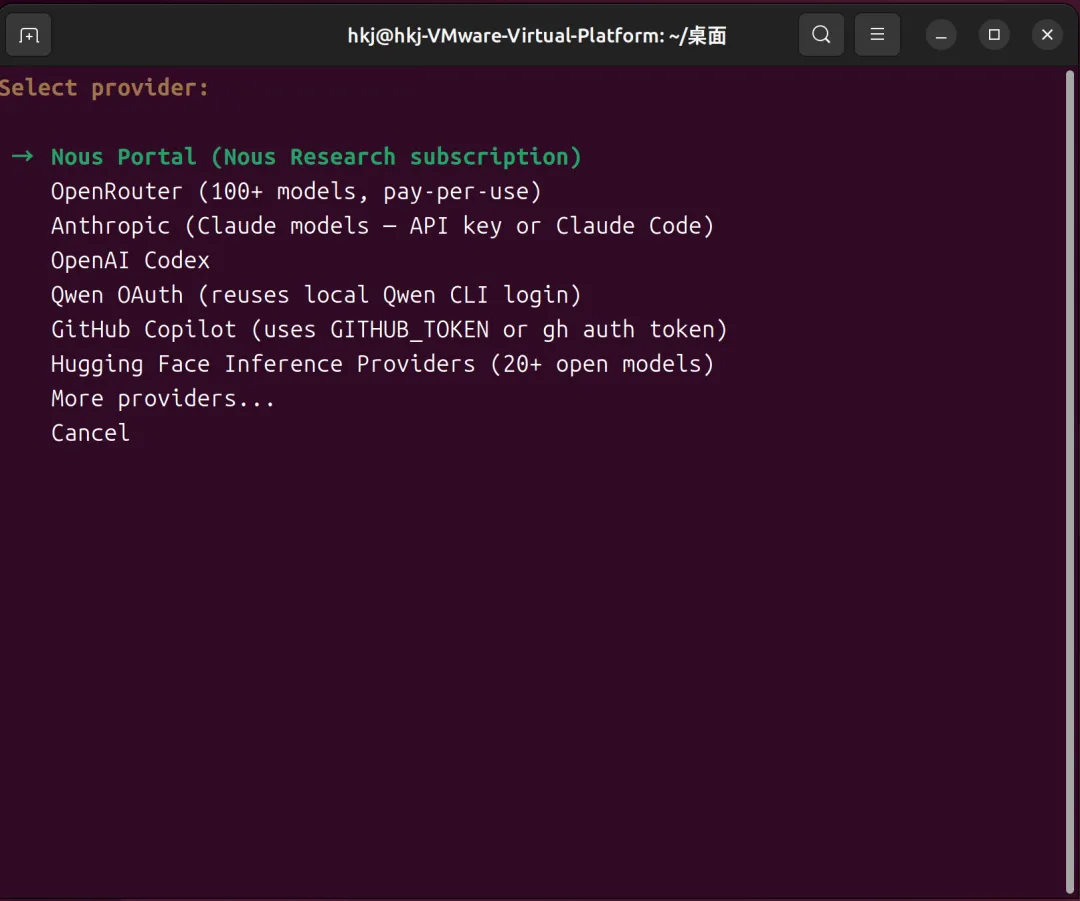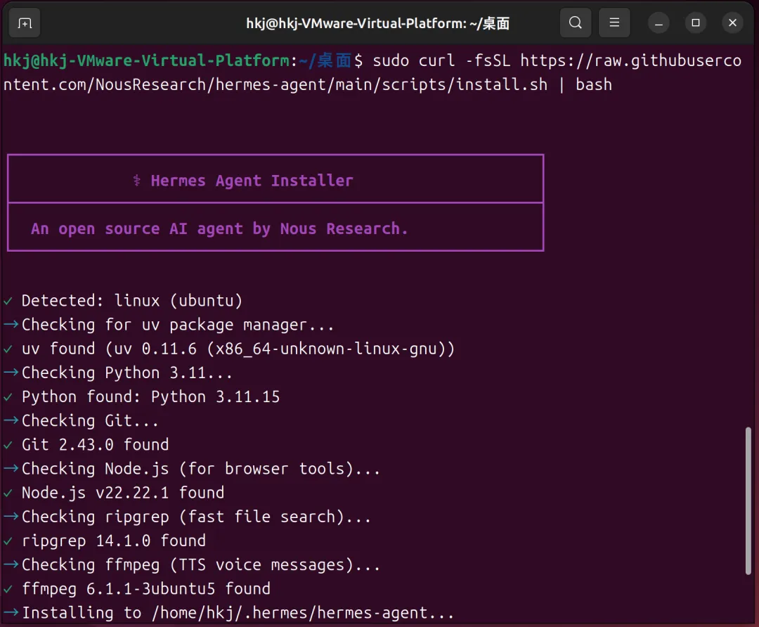 因为hermes agent不支持原生Windows系统,所以我建了一个Ubuntu 24.04.3 LTS的虚拟机来安装这个工具。
