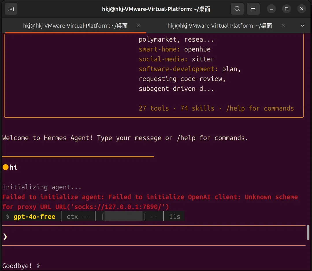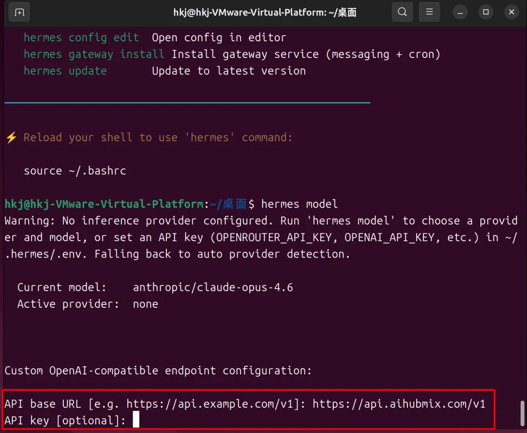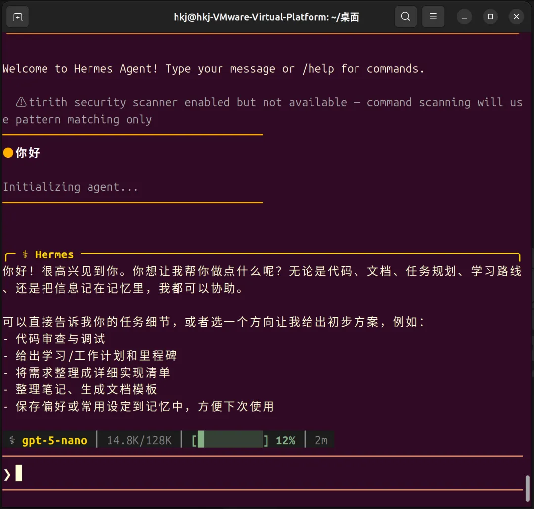 因为hermes agent不支持原生Windows系统,所以我建了一个Ubuntu 24.04.3 LTS的虚拟机来安装这个工具。