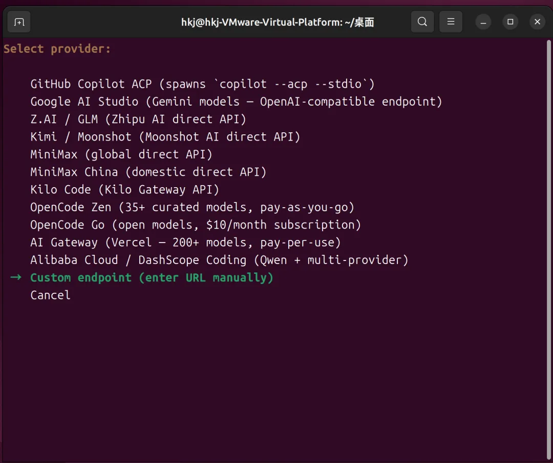 因为我的中转站aihubmix比较小众,这里也没有,只能选择Custom endpoint这个选项来自定义自己的模型。