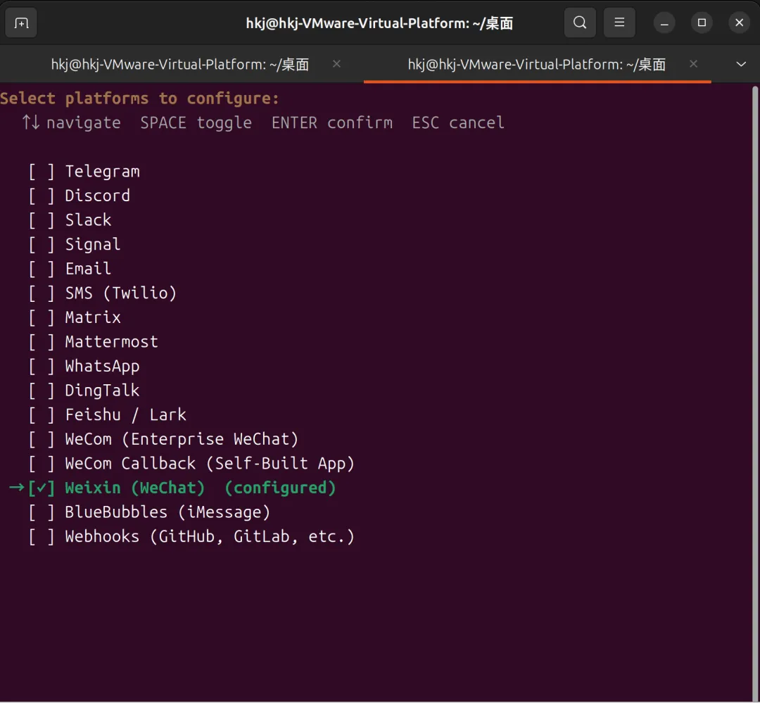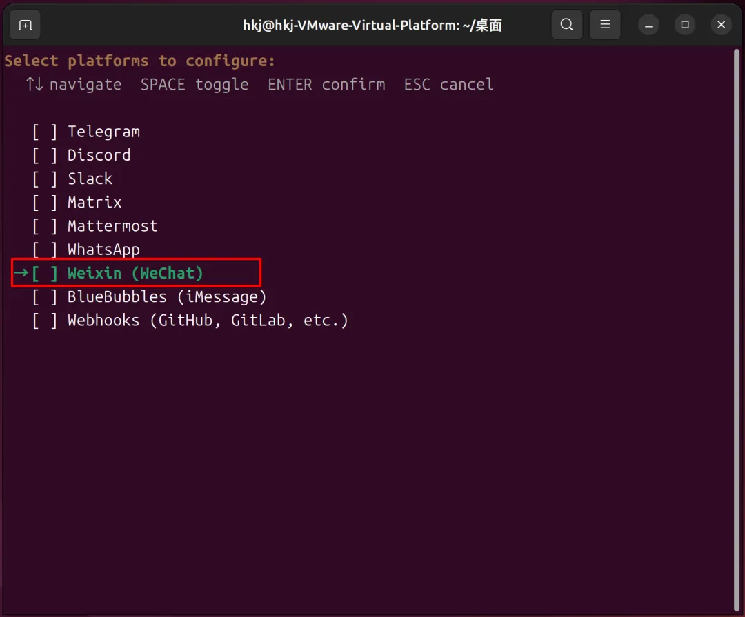 选择到微信,然后按空格,给微信选项打上勾,然后回车。如果你直接回车的话会直接跳过这一步。
