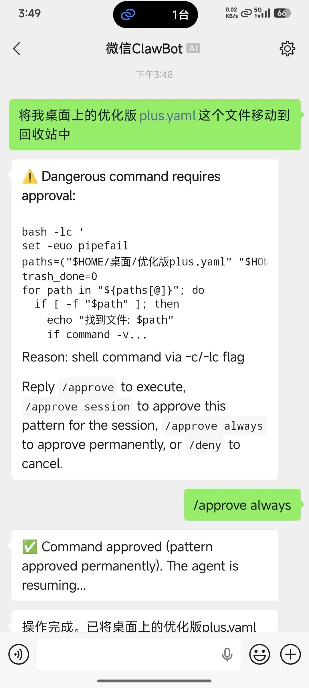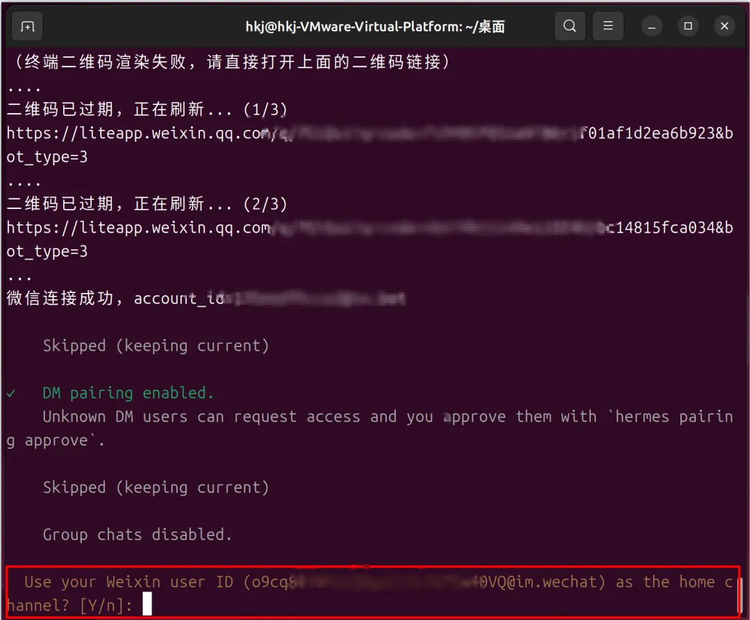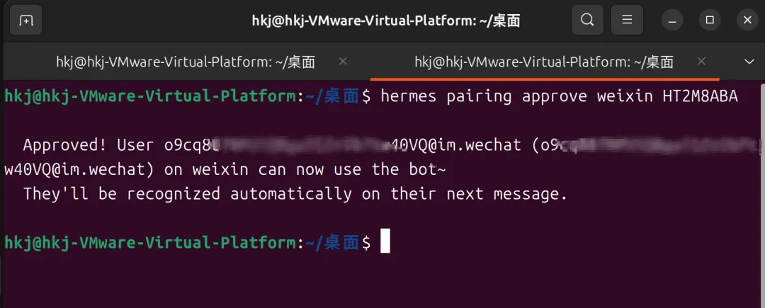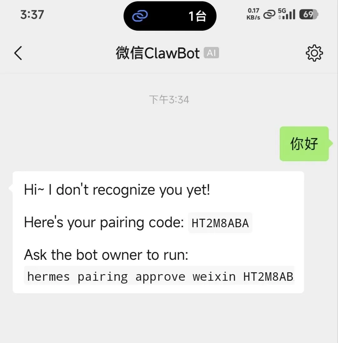 hermes pairing approve weixin HT2M8ABA这里需要注意的一点是:手机上给的这个命令中的pairing code是不完整的,一般会缺少最后一个字母或数字,所以要用上面给的完整pairing code,不要直接将手机上的这个命令粘上去。