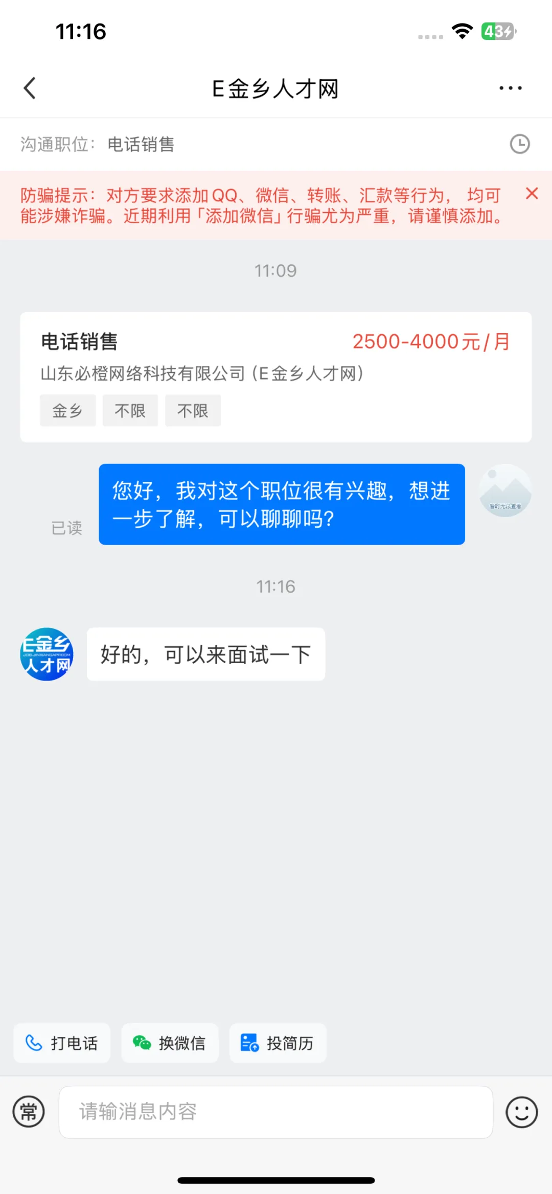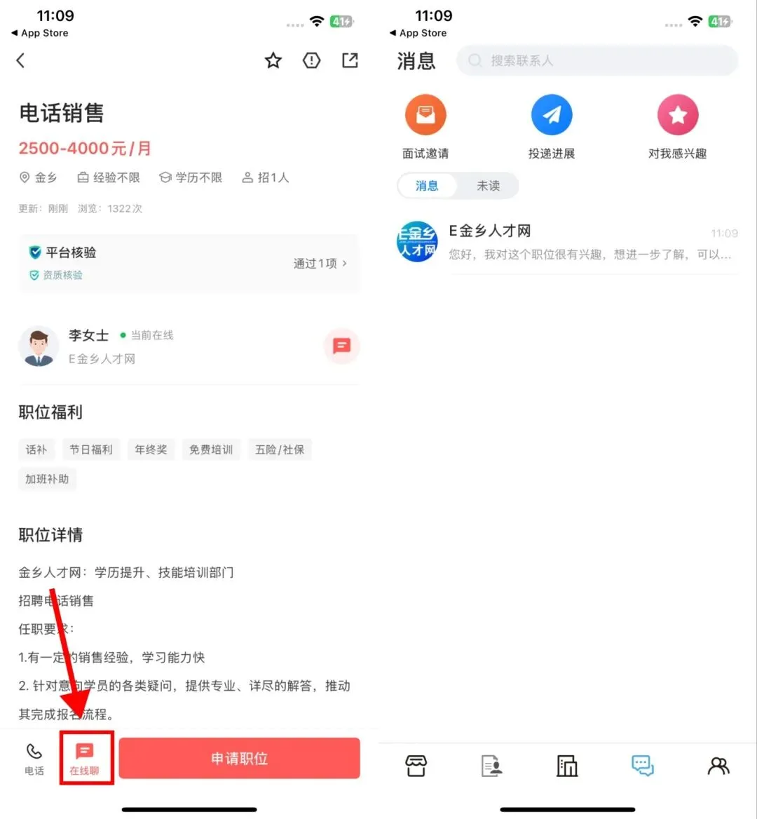 打开岗位点击“在线聊”与企业HR在线沟通