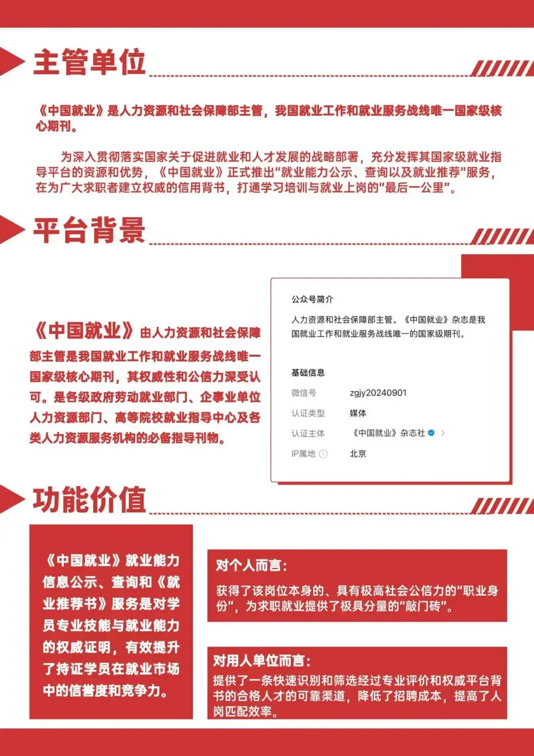 国家级期刊公示:取证信息在《中国就业》期刊公示,该期刊由人社部主管,是我国就业工作唯一国家级核心期刊,职业能力证明更具公信力。