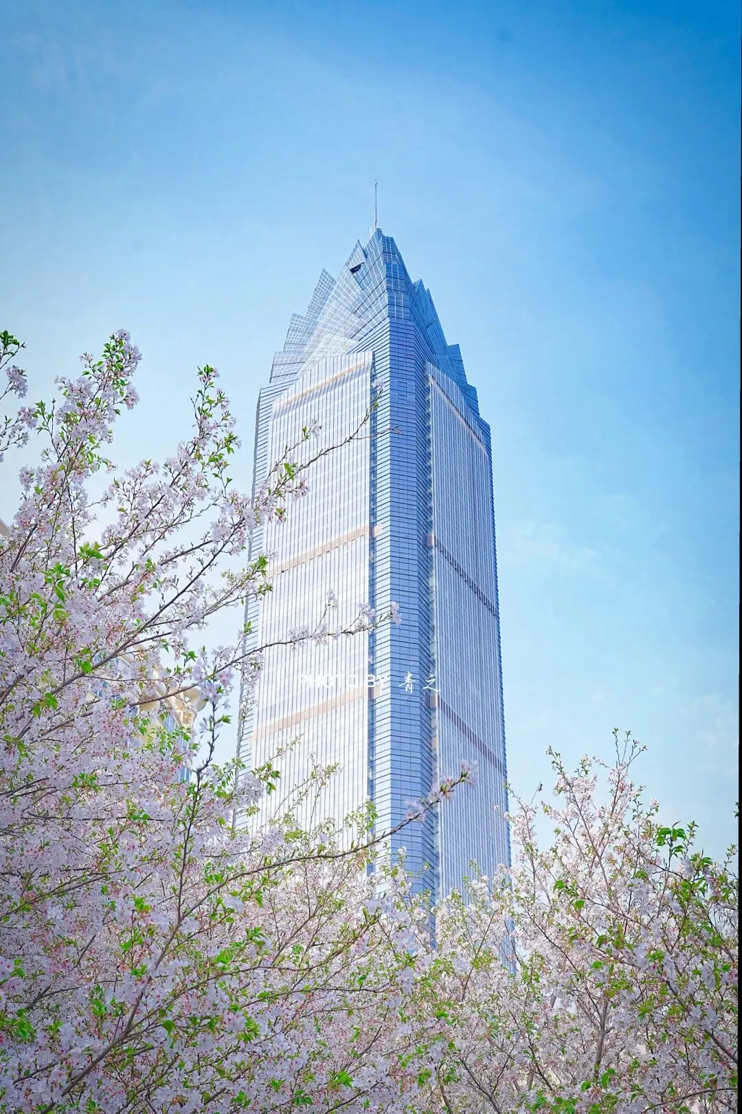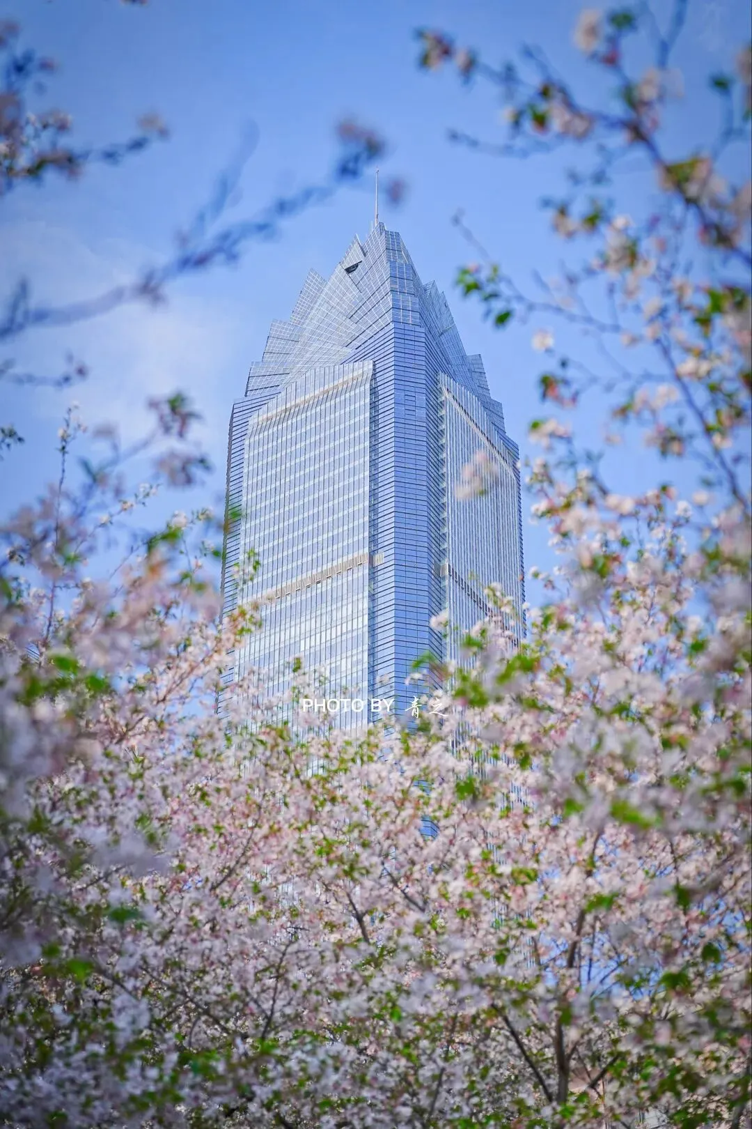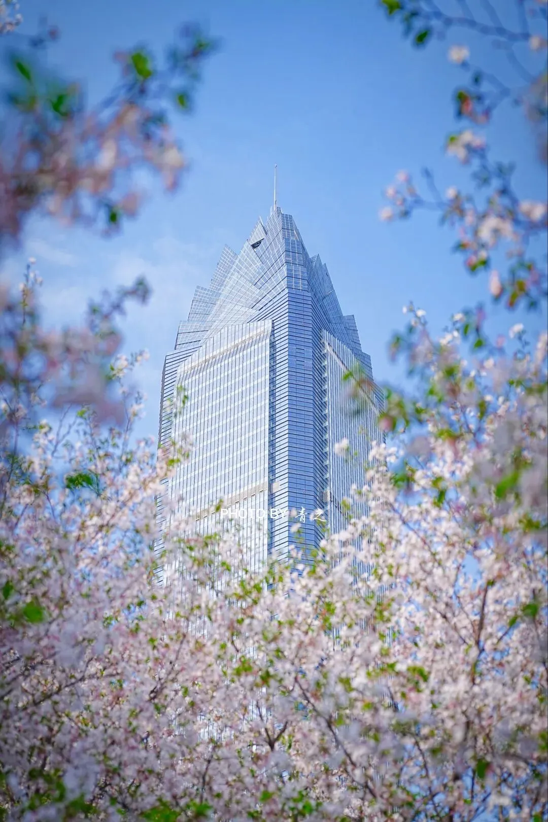 走到樱花园中心位置,稍微蹲低一点仰拍,你会发现樱花低垂的枝桠正好框住了远处世贸大厦的尖顶。