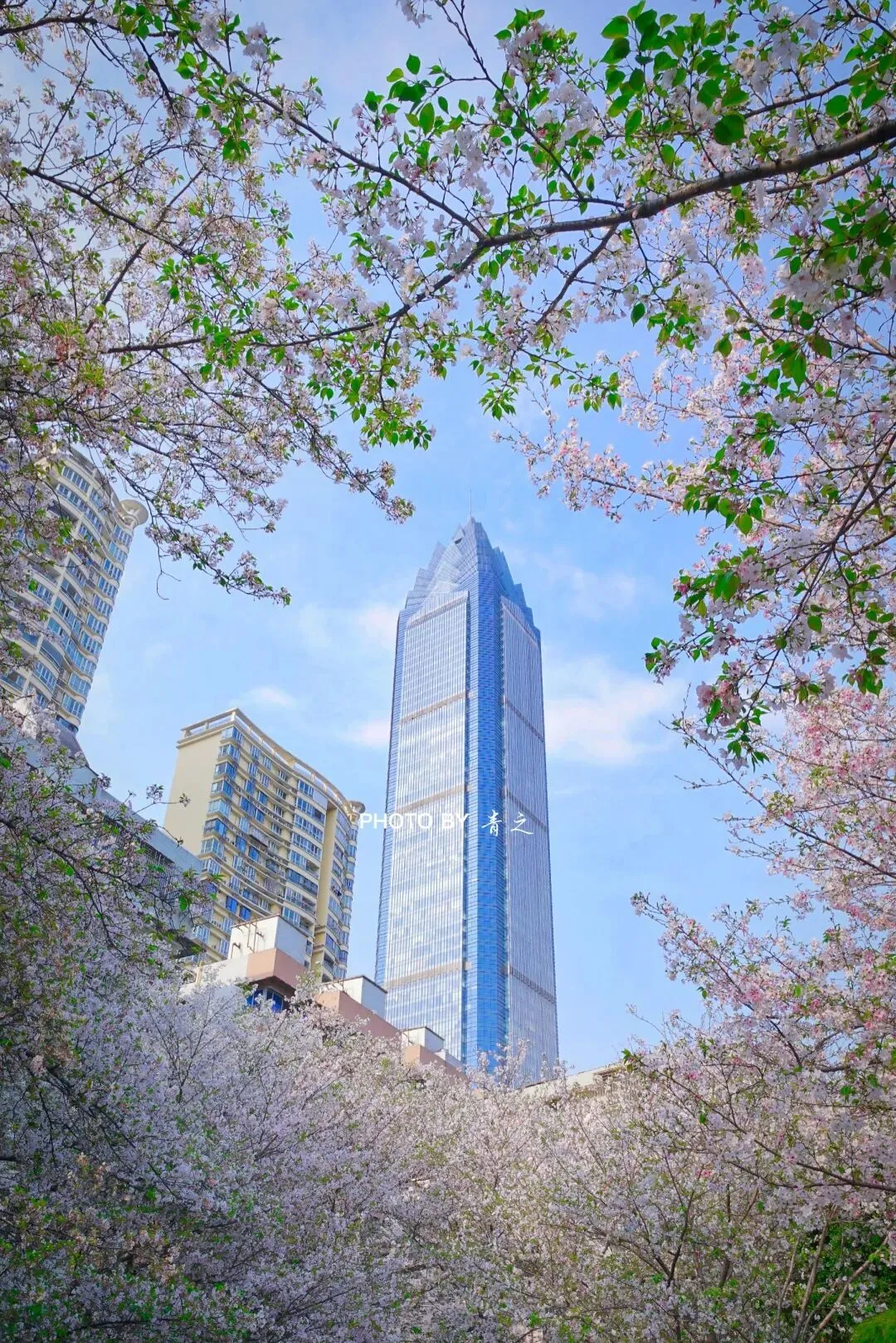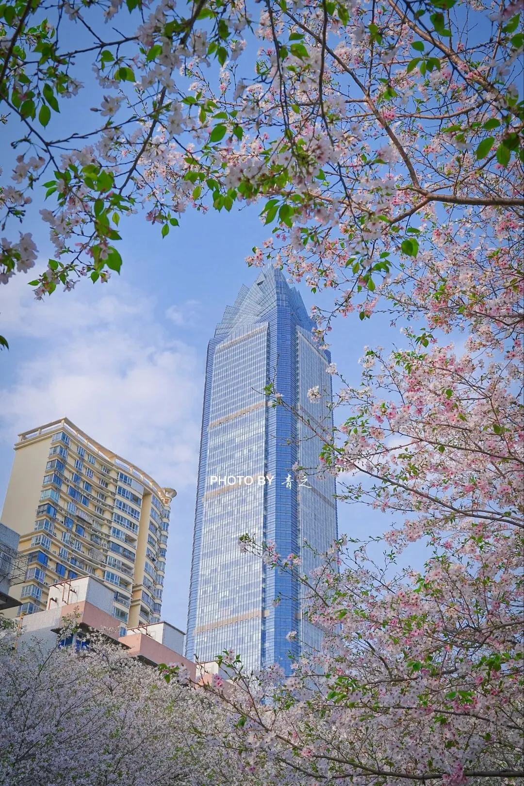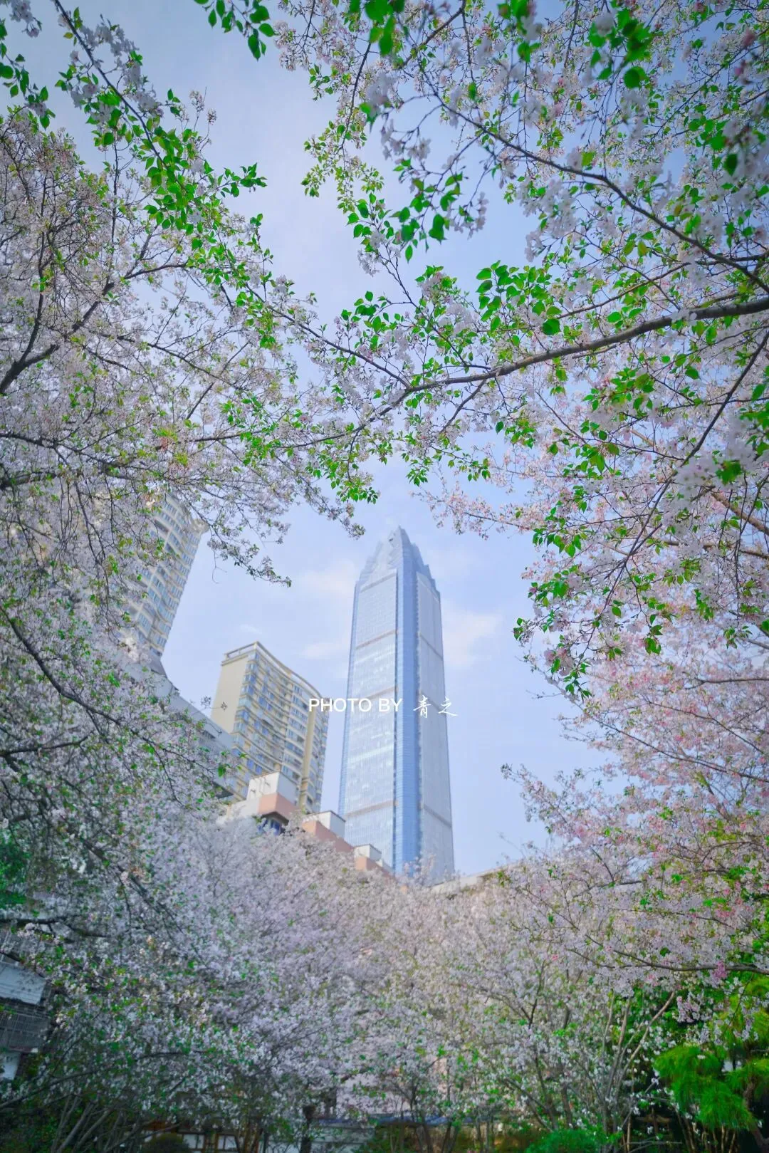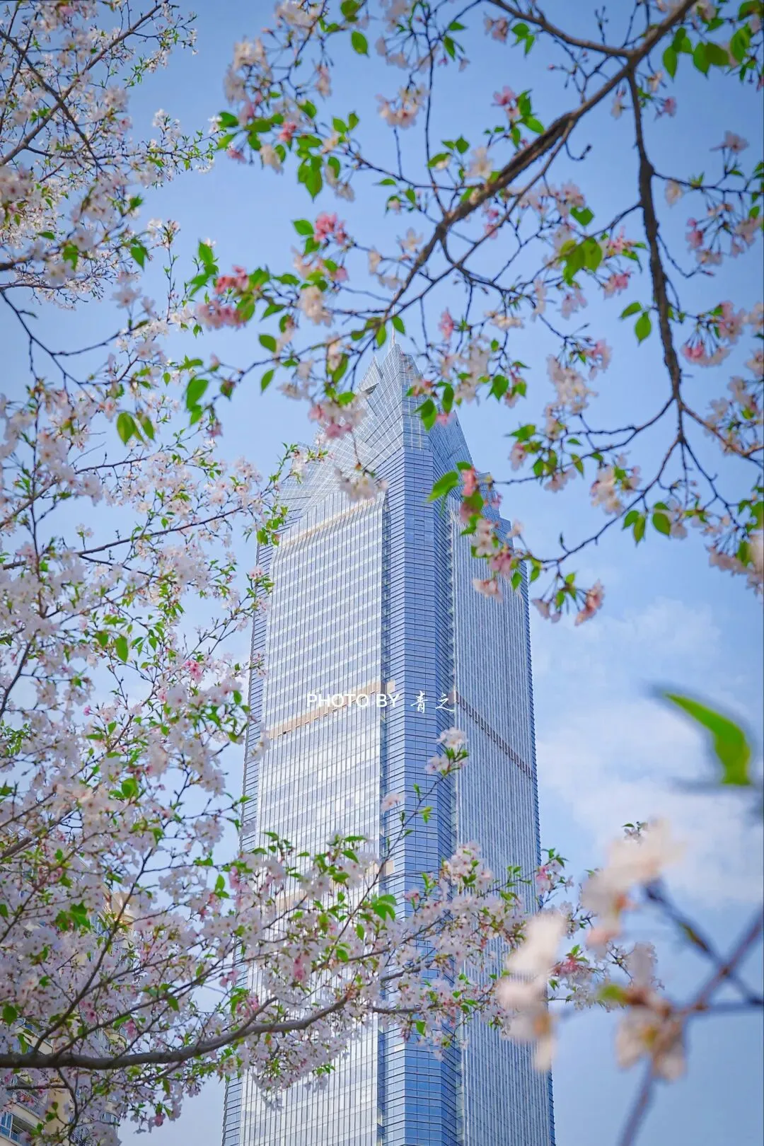 走到樱花园中心位置,稍微蹲低一点仰拍,你会发现樱花低垂的枝桠正好框住了远处世贸大厦的尖顶。