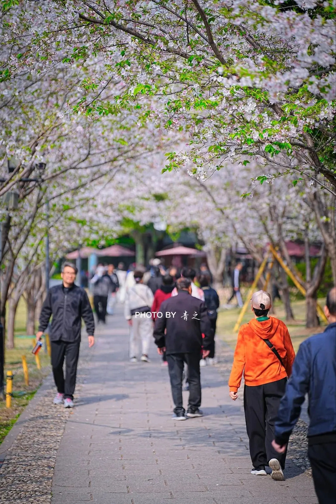 不用跑远,也不用买门票,从公园西门拐进去,好家伙,一整片粉白色的樱花长廊直接怼到眼前。