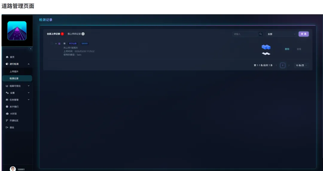 传统道路病害检测依赖人工巡查或简易设备,存在效率低、漏检率高、数据追溯难等问题。本开源AI道路监测系统通过集成深度学习模型与自动化管理平台,将路面图像上传、病害识别、结果统计、任务分配等功能整合于一体,实现道路巡检的智能化转型,降低人工成本,提升检测精度与可追溯性。