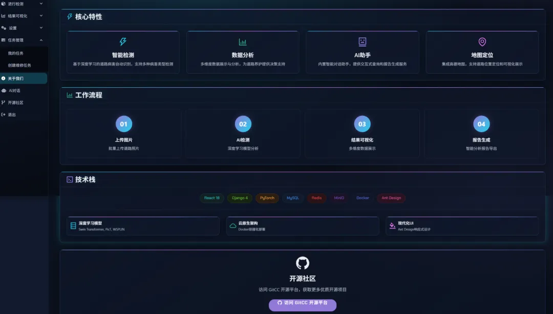 面向道路养护与巡检的平台:上传路面图像,由深度学习模型自动识别病害类型与程度,并提供统计可视化、任务管理与 AI 对话辅助,便于运营对外介绍与宣传。