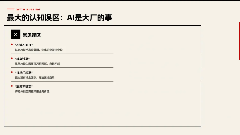 很多人对 AI 仍有误解:觉得遥不可及、成本太高、没有技术团队玩不转、担心看不到效果。事实上,AI 早已不是科技大厂的专利,而是每一家企业、每一位职场人都必须掌握的工具。