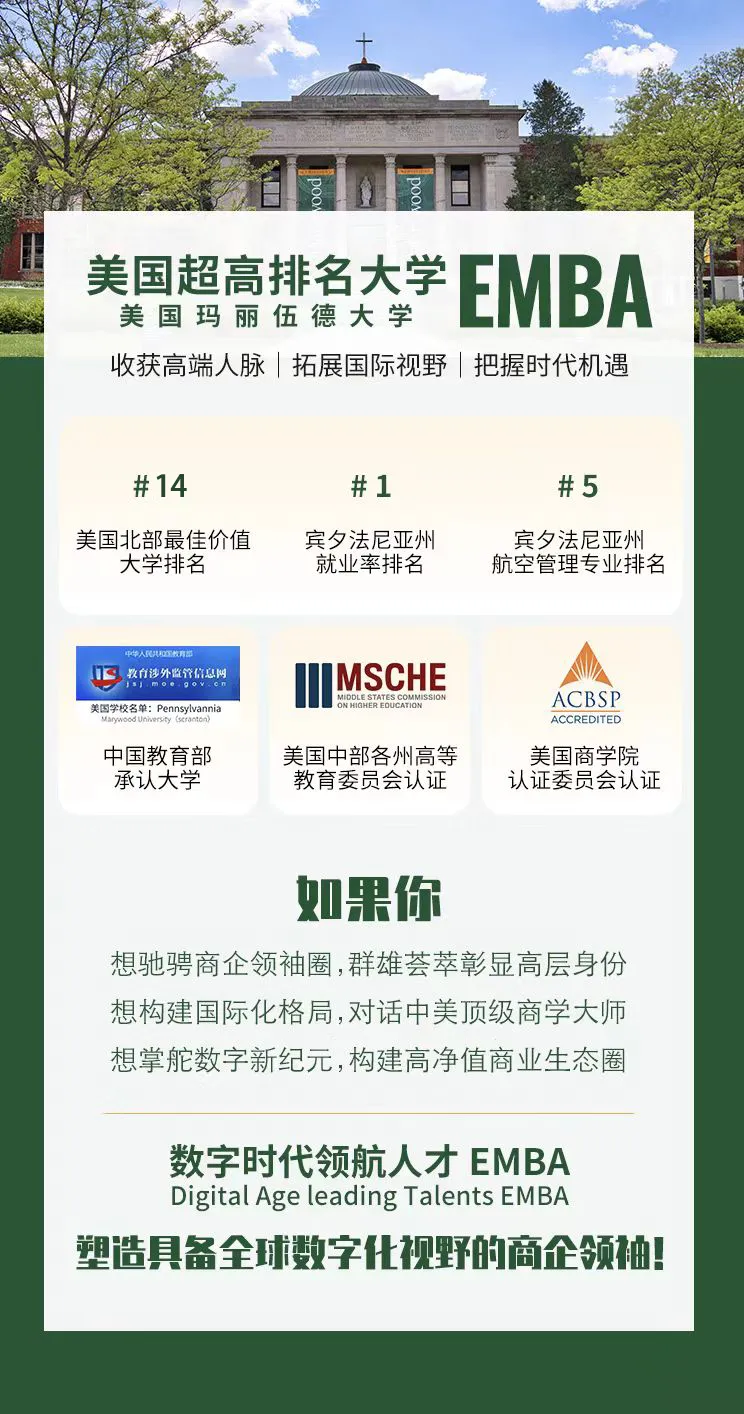 数字时代领航人才EMBA是清控紫荆教育与美国玛丽伍德大学联合培养的面向高层管理人员的不出国在职EMBA项目。课程结合美国排名前5大商学院教学特色,让学员畅享:从思路到出路,从方法到结果的教学逻辑;数字时代课题贯穿的教学内容;以及理论学习、实操训练、案例教学、团队协作等多元化的学习体验。学生通过线上研讨与线下互动的方式充分交融,对话中国顶级商学大师。在16个月的沉浸式学习体验中,收获高端人脉,拓展国际视野,把握时代机遇、升华思维、格局与境界。