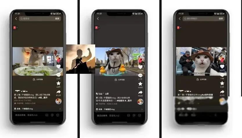但这类账号做的是"猫咪拟人化生活vlog"——把猫咪的行为套进人类的日常场景里,上班、摸鱼、做饭、发呆……
