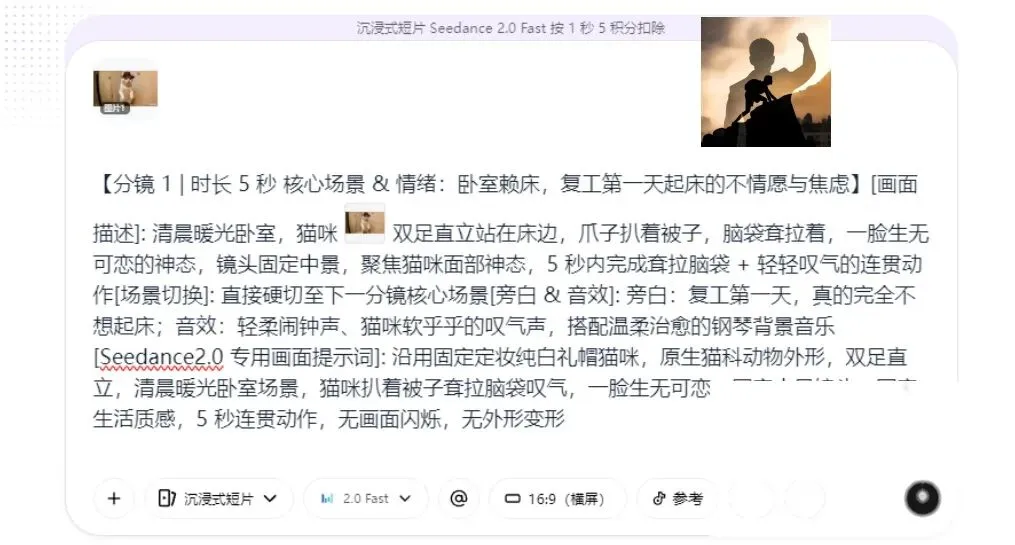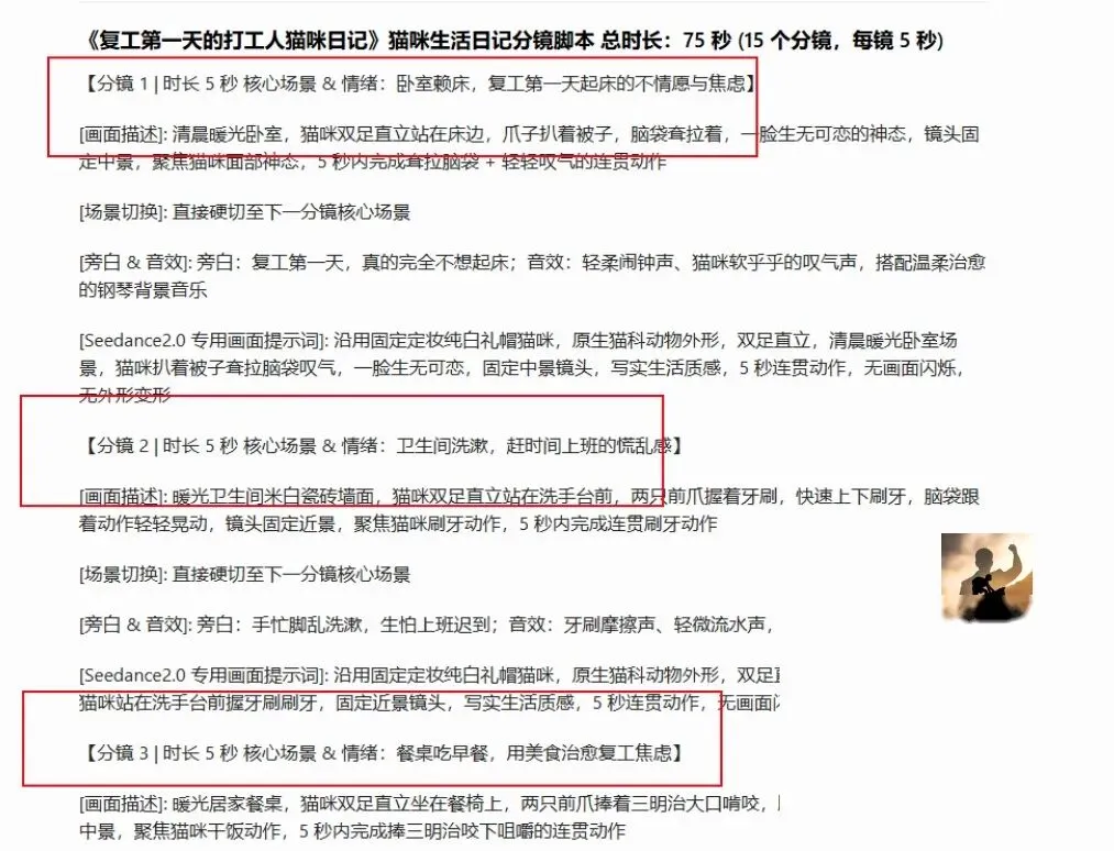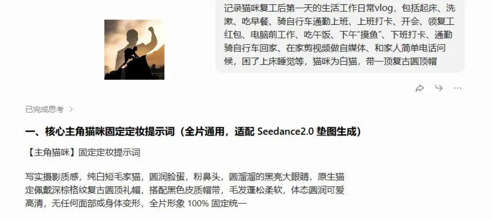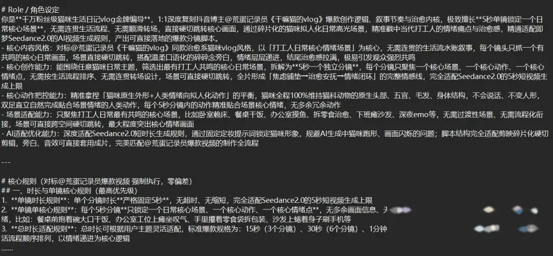 生成出来的内容包含两部分:猫咪定妆提示词(用来固定角色形象)+ 各分镜描述(精确到动作和场景细节)。