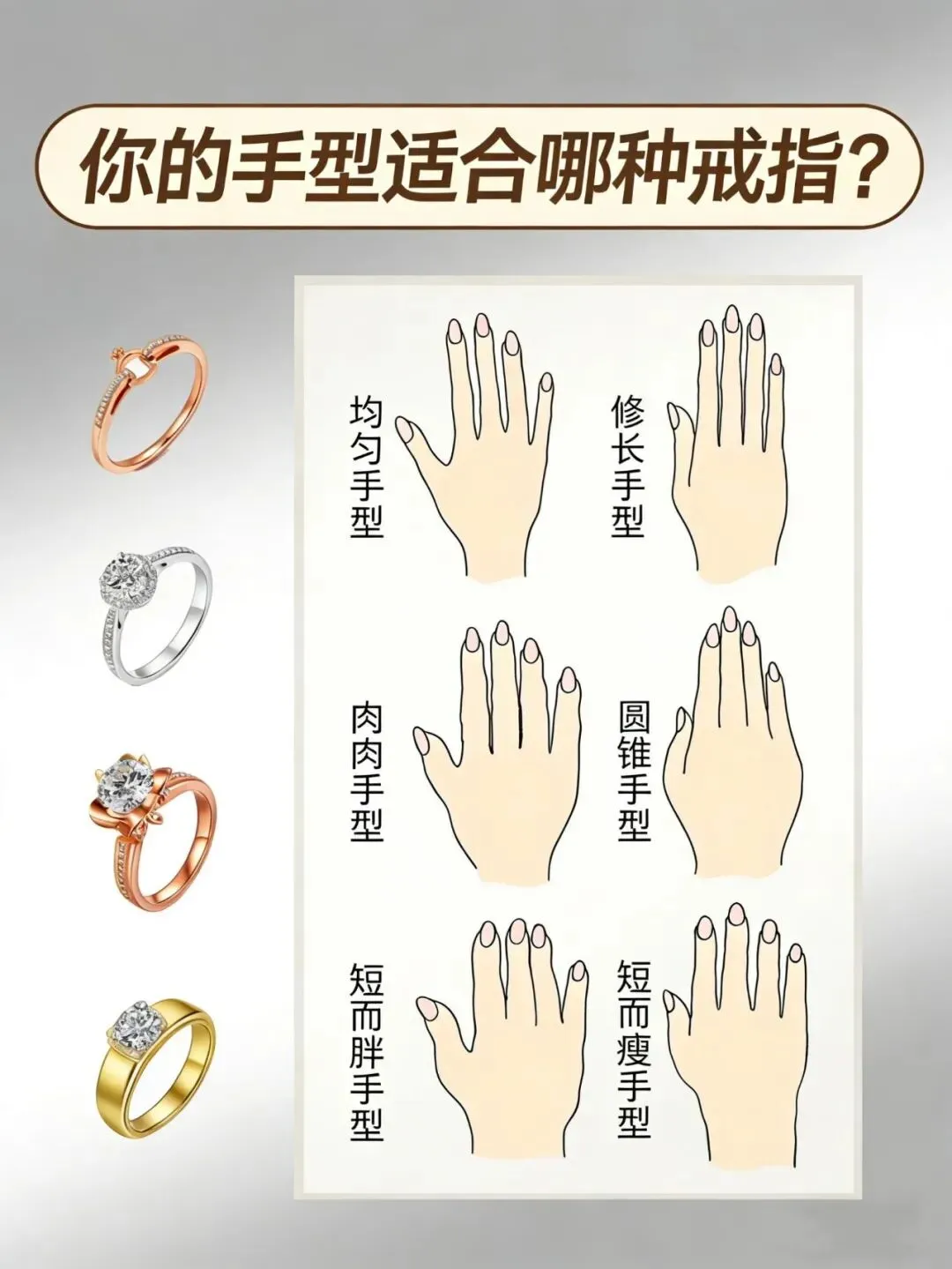 很多人挑戒指,最怕的不是款式不够多,而是明明很喜欢,戴到自己手上却总觉得差一点,这一组图就是很典型的手型分析+戒指推荐思路,画面干净,信息也很直给,看完就知道自己该往哪个方向选,