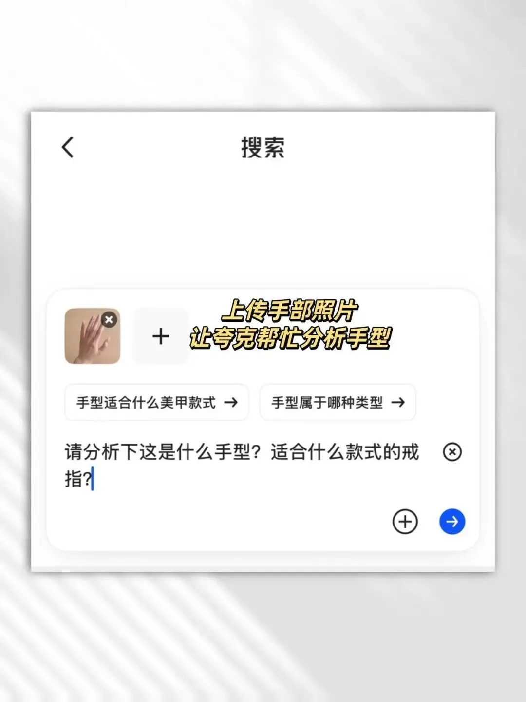 第三张开始进入实操界面,重点不是展示结果,而是告诉你:如果自己拿不准,直接上传手部照片去分析就行,画面里有上传入口,也有提问方向,比如适合什么戒指,属于哪种手型,这种方式对不太会自己判断的人特别友好,