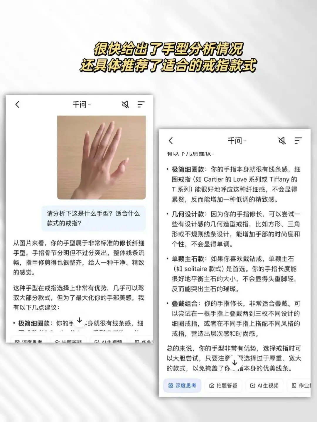 它上镜的点,在于把“不会选”这件事变得很轻,像平时站在柜台前犹豫很久,现在先在线上把方向捋顺,再去挑,会省心很多,很多人会把问题问得太散,其实只要先确认自己是什么手型,再问适合什么款式,答案会更有针对性,这一张在整组里起到转场作用,从认知进入实际操作,