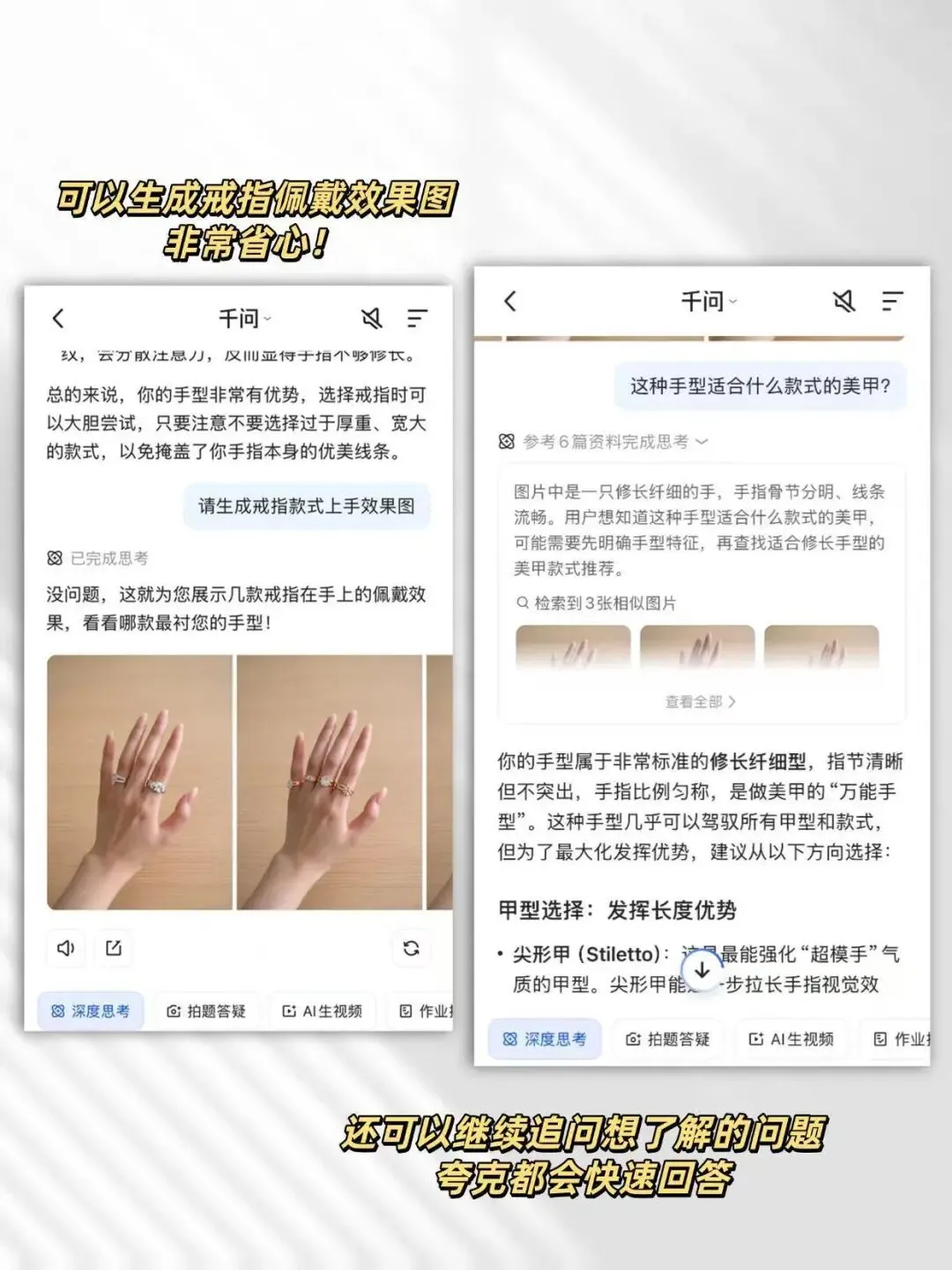 最后一张把推荐进一步落到了效果图上,还能继续追问,比如戒指上手效果,美甲方向这些,等于从“知道适合什么”走到了“直接看到戴上会怎样”,左边是生成的佩戴效果,右边是延伸问题的回答,整个思路非常完整,