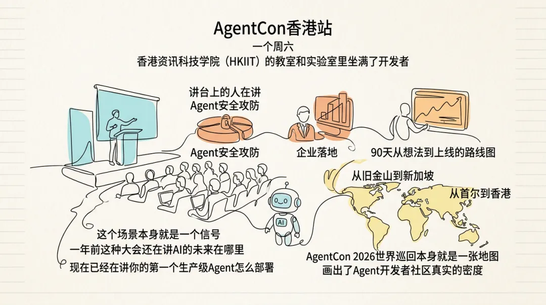 AgentCon 香港站,一个周六,香港资讯科技学院(HKIIT)的教室和实验室里坐满了开发者。讲台上的人在讲 Agent 安全攻防、企业落地、90 天从想法到上线的路线图。这个场景本身就是一个信号——一年前这种大会还在讲"AI 的未来在哪里",现在已经在讲"你的第一个生产级 Agent 怎么部署"。从旧金山到新加坡,从首尔到香港,AgentCon 2026 世界巡回本身就是一张地图,画出了 Agent 开发者社区真实的密度。