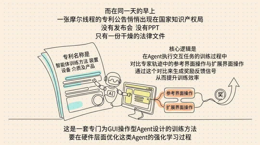 先看摩尔线程这张专利说了什么。专利名称是"智能体训练方法、装置、设备、介质及产品",核心逻辑是:在 Agent 执行交互任务的训练过程中,对比"专家轨迹"中的参考界面操作与扩展界面操作,通过这个对比来生成奖励反馈信号,从而提升训练效率。用更直白的话说:这是一套专门为 "GUI 操作型 Agent"(就是那种能控制电脑屏幕、点按钮、填表单的 Agent)设计的训练方法,要在 硬件层面优化这类 Agent 的强化学习过程。