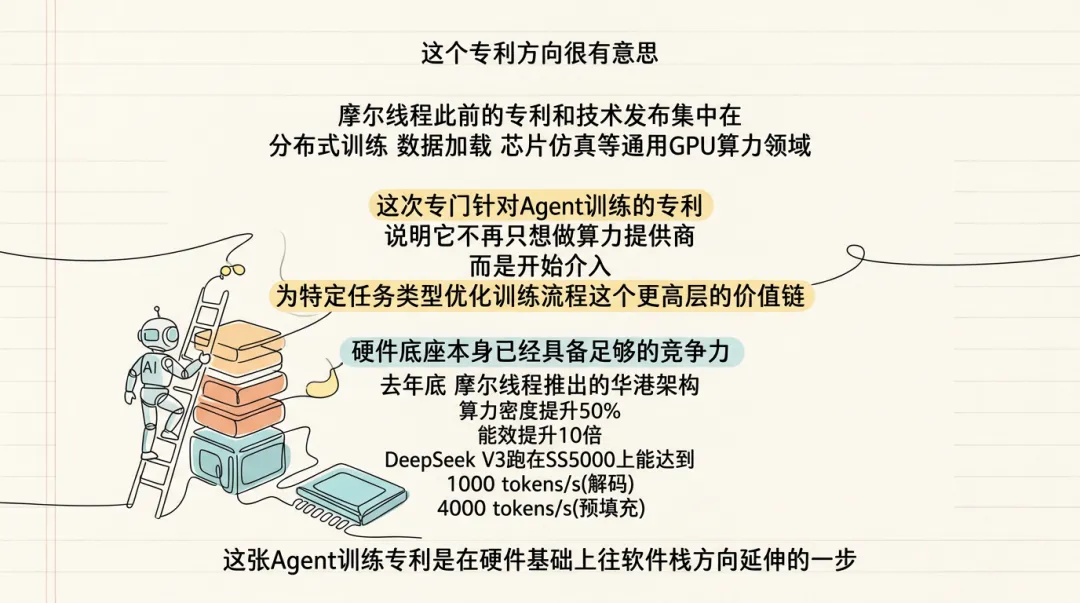 这个专利方向很有意思。摩尔线程此前的专利和技术发布集中在分布式训练、数据加载、芯片仿真等通用 GPU 算力领域。这次专门针对 Agent 训练的专利,说明它不再只想做"算力提供商",而是开始介入"为特定任务类型优化训练流程"这个更高层的价值链。去年底,摩尔线程推出的"华港"架构,算力密度提升 50%,能效提升 10 倍,DeepSeek V3 跑在其 S5000 上能达到 1000 tokens/s(解码)和 4000 tokens/s(预填充)——硬件底座本身已经具备足够的竞争力,这张 Agent 训练专利是在硬件基础上往软件栈方向延伸的一步。
