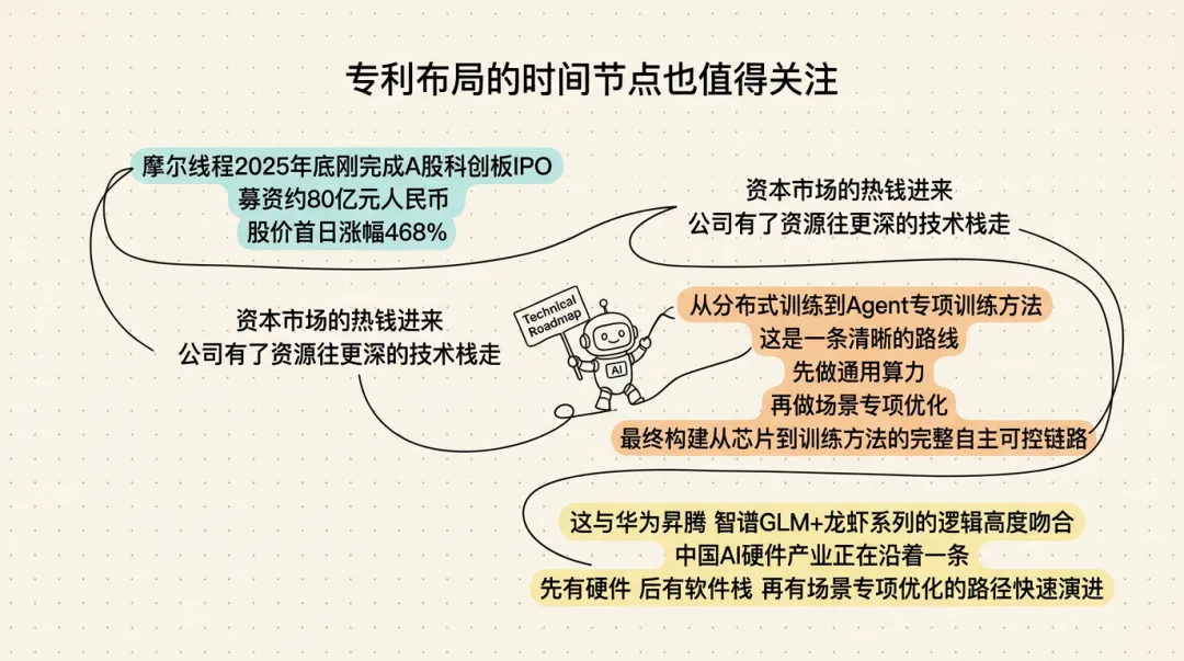 专利布局的时间节点也值得关注。摩尔线程 2025 年底刚完成 A 股科创板 IPO,募资约 80 亿元人民币,股价首日涨幅 468%。资本市场的热钱进来,公司有了资源往更深的技术栈走。从分布式训练到 Agent 专项训练方法,这是一条清晰的路线:先做通用算力,再做场景专项优化,最终构建从芯片到训练方法的完整自主可控链路。这与华为昇腾、智谱 GLM + 龙虾系列的逻辑高度吻合——中国 AI 硬件产业正在沿着一条"先有硬件,后有软件栈,再有场景专项优化"的路径快速演进。