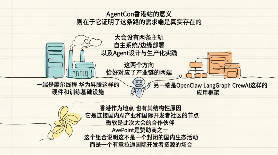 AgentCon 香港站的意义,则在于它证明了这条路的需求端是真实存在的。大会设有两条主轨:自主系统/边缘部署,以及 Agent 设计与生产化实践。这两个方向,恰好对应了产业链的两端——一端是摩尔线程、华为昇腾这样的硬件和训练基础设施,另一端是 OpenClaw、LangGraph、CrewAI 这样的应用框架。香港作为地点,也有其结构性原因:它是连接国内 AI 产业和国际开发者社区的节点,微软是此次大会的合作伙伴,AvePoint 是赞助商之一——这个组合说明这不是一个封闭的国内生态活动,而是一个有意拉通国际开发者资源的场合。