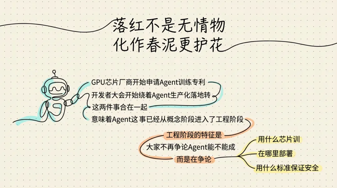 "落红不是无情物,化作春泥更护花。"GPU 芯片厂商开始申请 Agent 训练专利,开发者大会开始绕着 Agent 生产化落地转——这两件事合在一起,意味着 Agent 这件事已经从"概念阶段"进入了"工程阶段"。工程阶段的特征是:大家不再争论 Agent 能不能成,而是在争论用什么芯片训、在哪里部署、用什么标准保证安全。