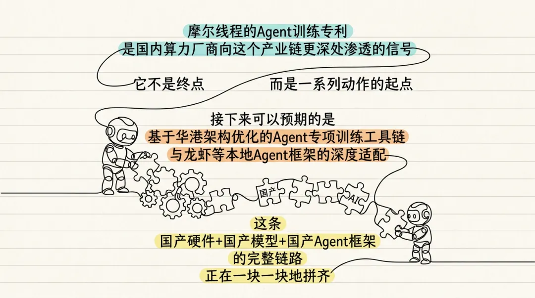 摩尔线程的 Agent 训练专利,是国内算力厂商向这个产业链更深处渗透的信号。它不是终点,而是一系列动作的起点——接下来可以预期的是,基于华港架构优化的 Agent 专项训练工具链、与龙虾等本地 Agent 框架的深度适配。这条"国产硬件 + 国产模型 + 国产 Agent 框架"的完整链路,正在一块一块地拼齐。