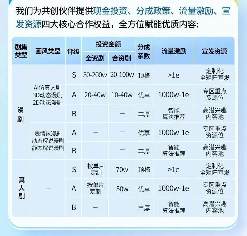 最新!2026AI短剧全平台分发渠道汇总,附平台政策!过去真人短剧是流量霸主,AI短剧、漫剧是边角料,现在风向已经慢慢改变。据DataEye研究院数据显示,2025 年漫剧市场已达168 亿,2026 年预计直冲240 亿。用户从1.2 亿暴增至2.8 亿,AI 仿真人短剧在百强榜的占比,更是从去年的7%狂飙到38%,春节档 86.7 亿的总播放量里,AI 短剧一口吞下近 30%。4月各大平台的动作也很快,都在给流量、开IP、搞补贴,真金白银往创作者身上砸。做 AI 短剧本质是一场 “找流量” 的游戏,好的内容只完成了一半,选对发行渠道同样重要,选对分发平台,才是放大收益、吃定红利的捷径。短视频平台对于绝大多数创作者,尤其是中小团队和个人,短视频综合平台永远是第一站,这里算法成熟、流量凶猛、用户活跃,是测款、起量、跑通流量的主战场。抖音系红果、抖音、番茄小说这三块加起来,流量太猛了,爽文、玄幻、都市、AI仿真人这些题材,在抖音系跑得最快,分成也给得高,生态最成熟。抖音集团短剧版权中心公布的激励政策,获得高评级的AI仿真人剧、2D/3D漫剧均可收获相应保底激励,IP方面,对于番茄小说原创头部IP,短剧版权中心可补贴100%漫剧改编权费用。快手深耕下沉市场,用户基数庞大,口味更接地气。家庭伦理、逆袭、年代剧更容易出数据。快手磁力引擎正式成立短剧生态业务中心,同步推出“磁力新剧计划”,直接拿出现金投资最高200万、分成激励、亿级流量和宣发资源,重点扶持AI短剧。微信视频号背靠微信十亿社交生态,私域传播能力强,裂变速度很快,涨粉路径很清晰,适合做私域沉淀。广告分成 + 商单变现,虽然保底不如抖音快手,但胜在用户粘性高、生命周期长。传统长视频平台当短视频在拼速度、拼数量时,传统长视频平台正在走另一条路,精品化、剧情化、IP 化。爱奇艺会员 + 广告双轮驱动,商业模式最成熟。用户愿意为优质内容付费,是沉淀高粘性、高价值粉丝的核心阵地。独家内容分成最高100%,非独家首发分账比例也达到了70%,对于中小团队来说非常友好。优酷重点押注3D、高画质、古风仙侠类,4月发布竖版短剧活动激励,按月度热力值发放奖励,设置多档阶梯式现金奖励,从1000热力值起奖,热力值到达10万及以上的合作方可获得10万元奖金。B 站年轻用户、二次元粉丝的大本营,氛围最好,用户忠诚度极高,适合做原创、科幻、悬疑、国风精品。独立垂直漫剧 APP除了综合平台,垂直漫剧 APP生态更专注、规则更清晰、用户更精准。腾讯・火龙漫剧2026 年新上线,背靠阅文 + 腾讯动漫的海量 IP 库,古风、言情、二次元改编先天优势拉满。独家内容分账系数高达200%,新平台流量红利期,机会巨大。AI短剧、漫剧的行业数据,平台补贴看着很诱人,门槛看似低,上限极高,但赚钱的永远是少数,信息在变,平台在变,唯一不变的是优质内容的稀缺。2026 年 AI 短剧赛道已经告别野蛮生长,平台从拼数量转向拼质量,补贴政策也向优质内容倾斜。随着 AI 技术普及,制作门槛会越来越低,未来淘汰的不是不会用工具的人,而是做不出好内容的人。不管你选择哪个平台,内容质量永远是核心竞争力,AI技术越来越成熟,制作门槛越来越低,最后能胜出的,一定是那些会讲故事的人。联系我们试用模力漫AI工具了解更多信息欢迎添加 备注来意点击左下角 关注我们