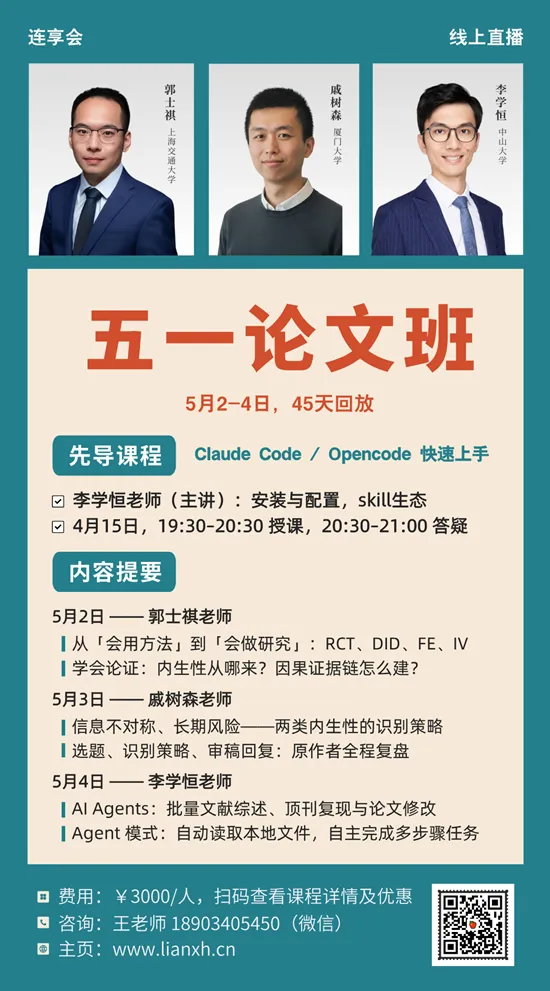 连享会:2026五一论文班 · 线上时间:4月15日(先导课),5月2-4日(正式课)嘉宾:郭士祺 (上海交通大学)、戚树森 (厦门大学)、李学恒 (中山大学)咨询:王老师 18903405450(微信)