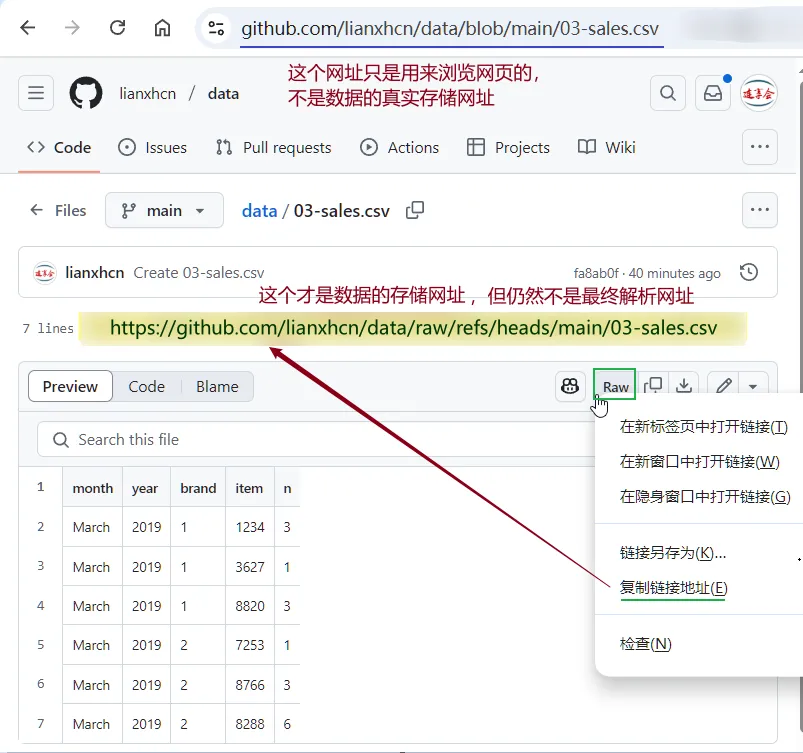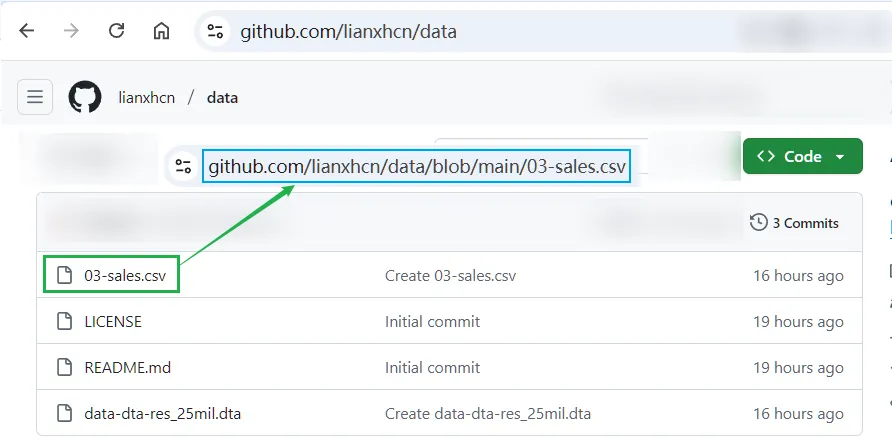 以 github 仓库 lianxhcn/data 中的 03-sales.csv 文件为例,你看到的文件链接是: